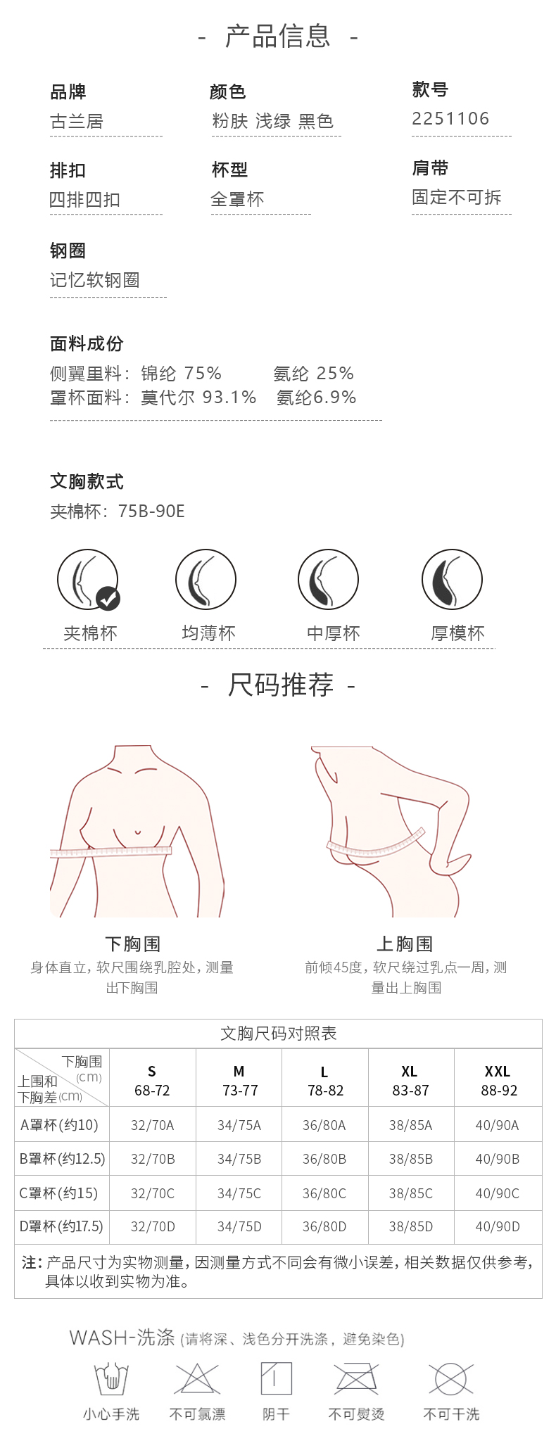- 做一线的品质,卖二线的价格,让大家都买得起高品质的贴身衣物是我成立品牌的初衷。亲研贴心衣物十余年,用心筛选每一款面料。