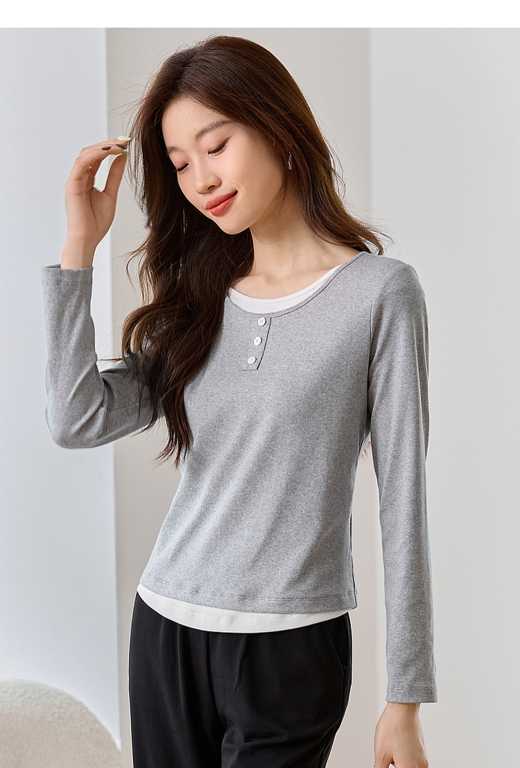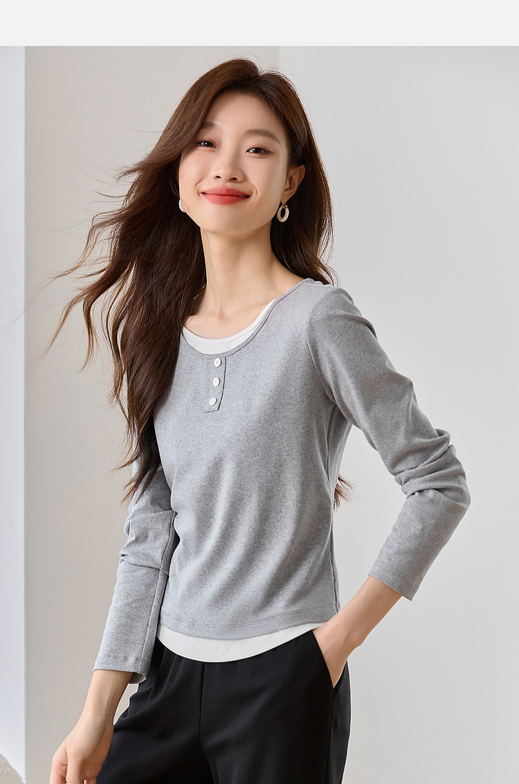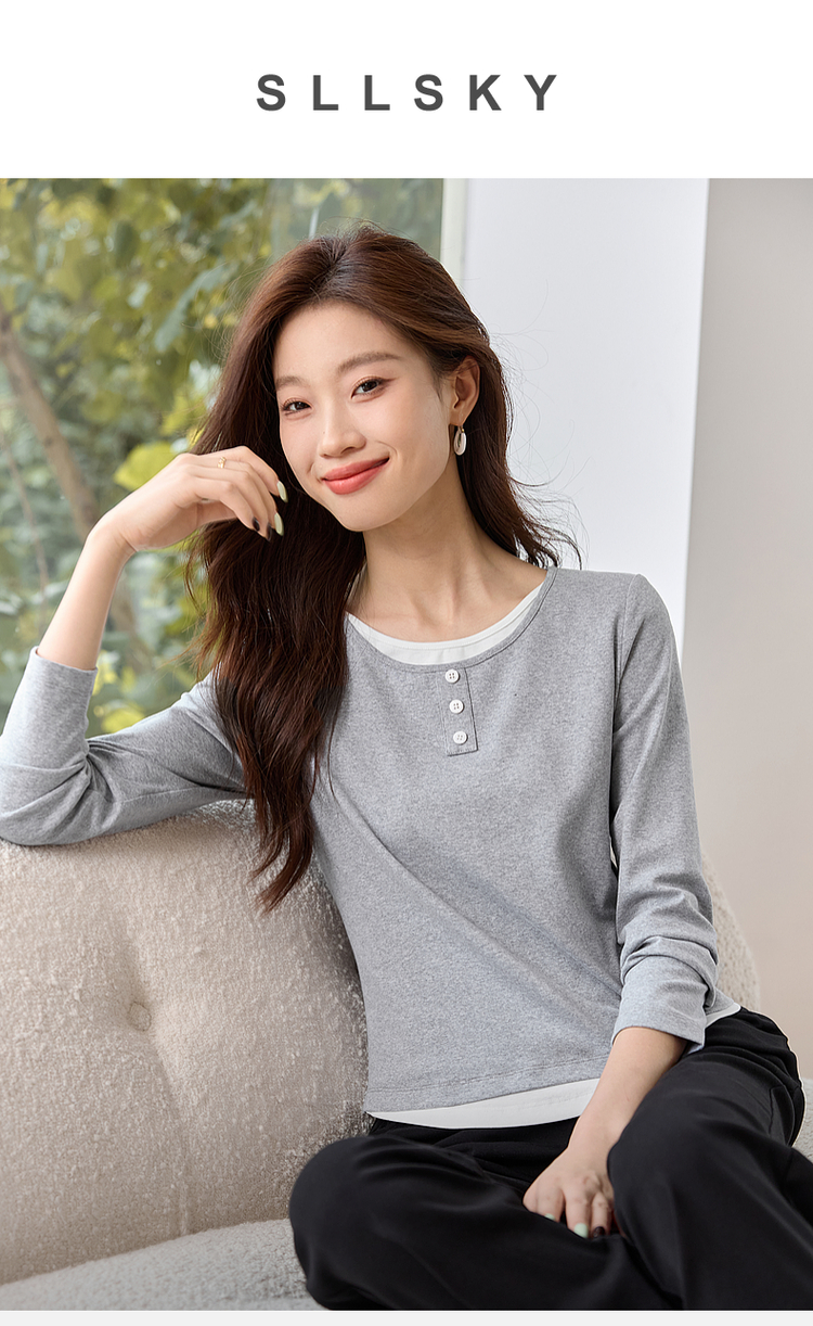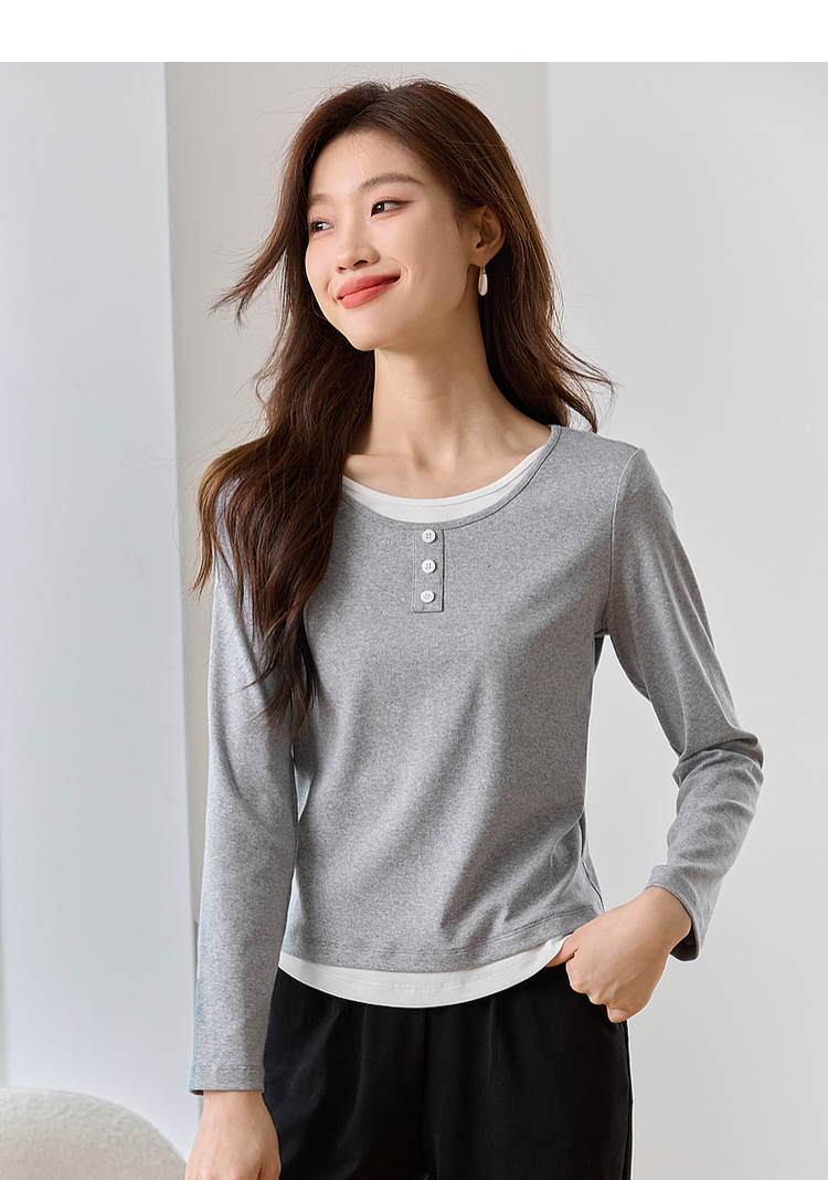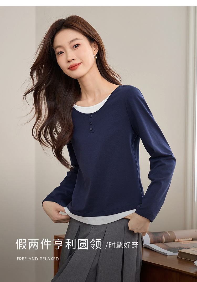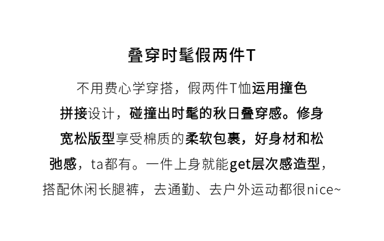 【1件71折】熙世界时髦假两件t恤长袖2025秋季修身圆领打底衫正肩显瘦上衣