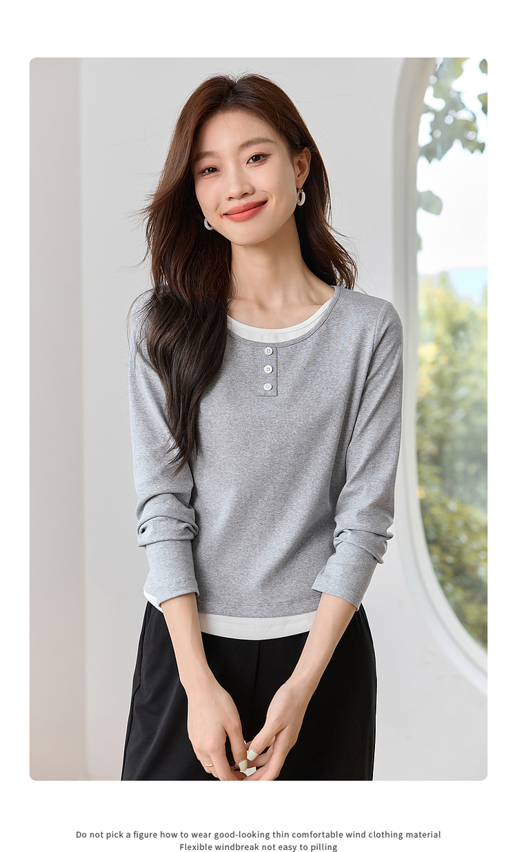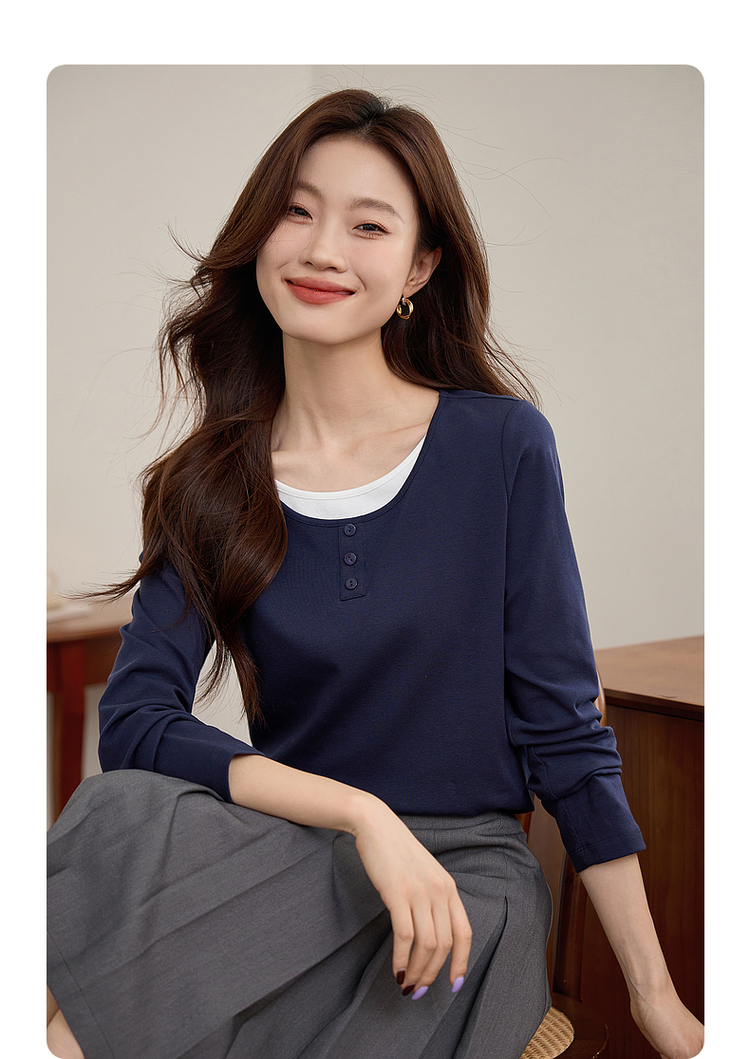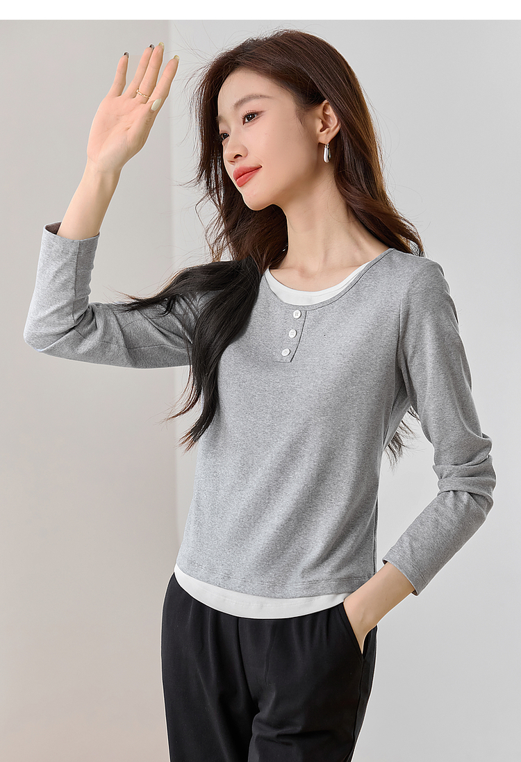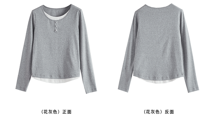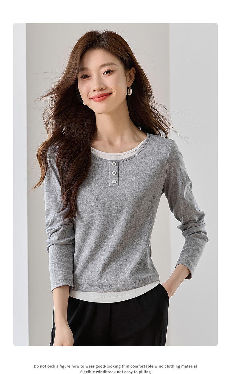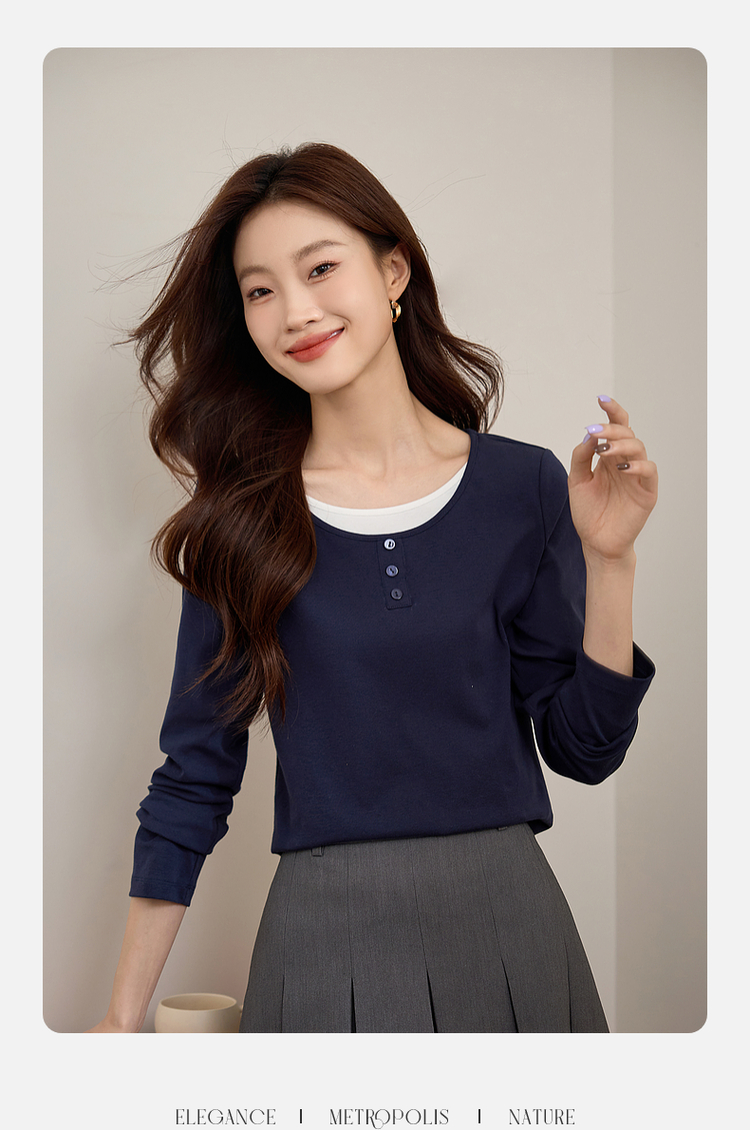【1件71折】熙世界时髦假两件t恤长袖2025秋季修身圆领打底衫正肩显瘦上衣