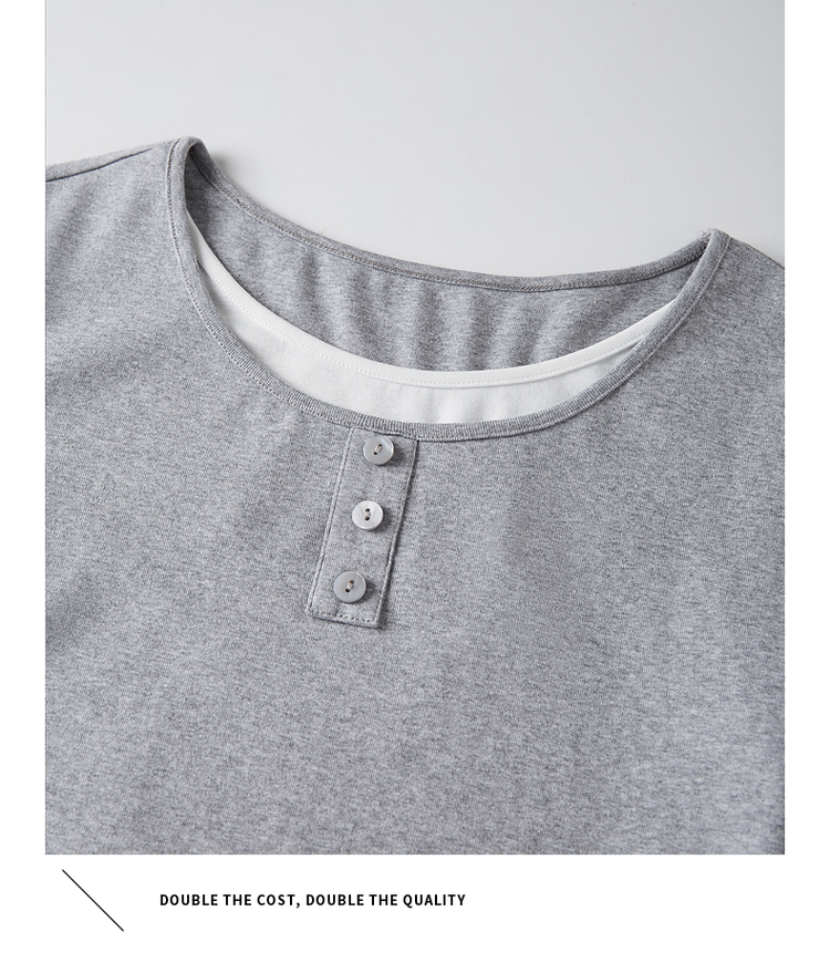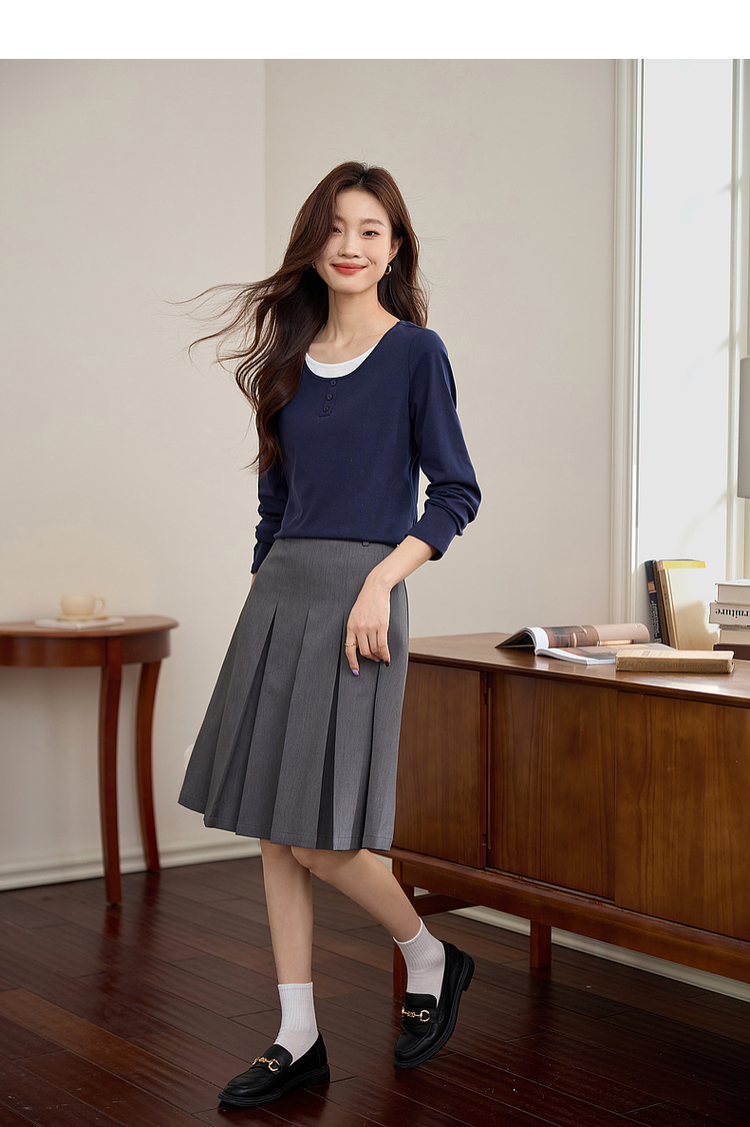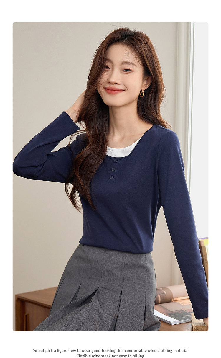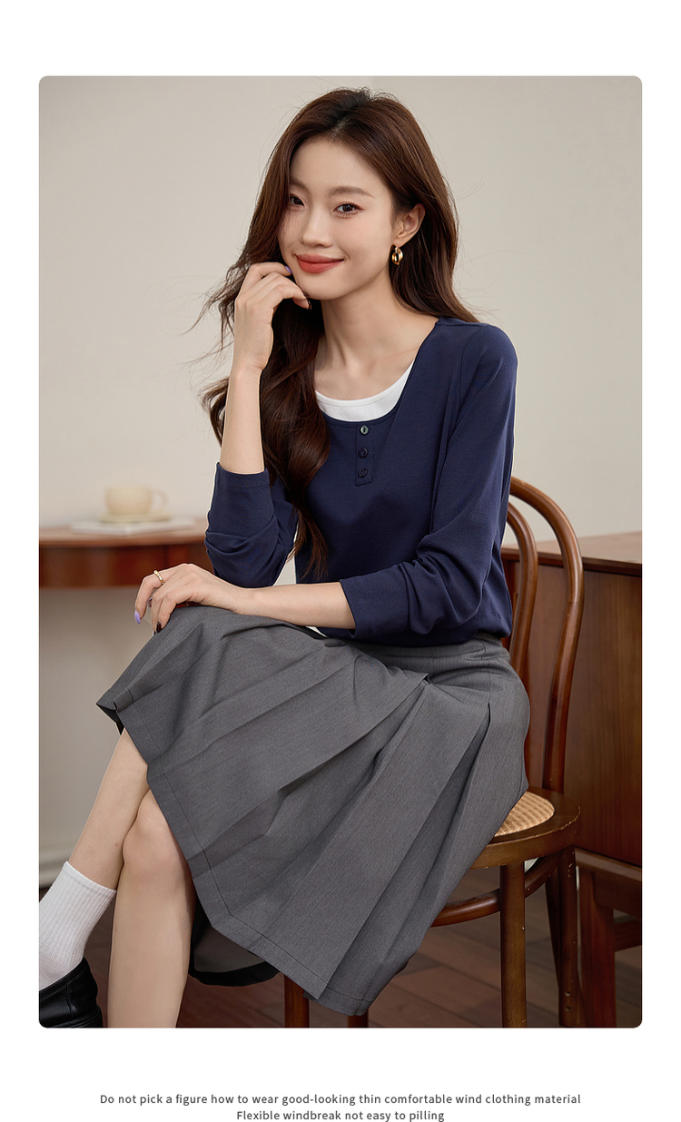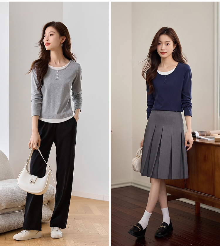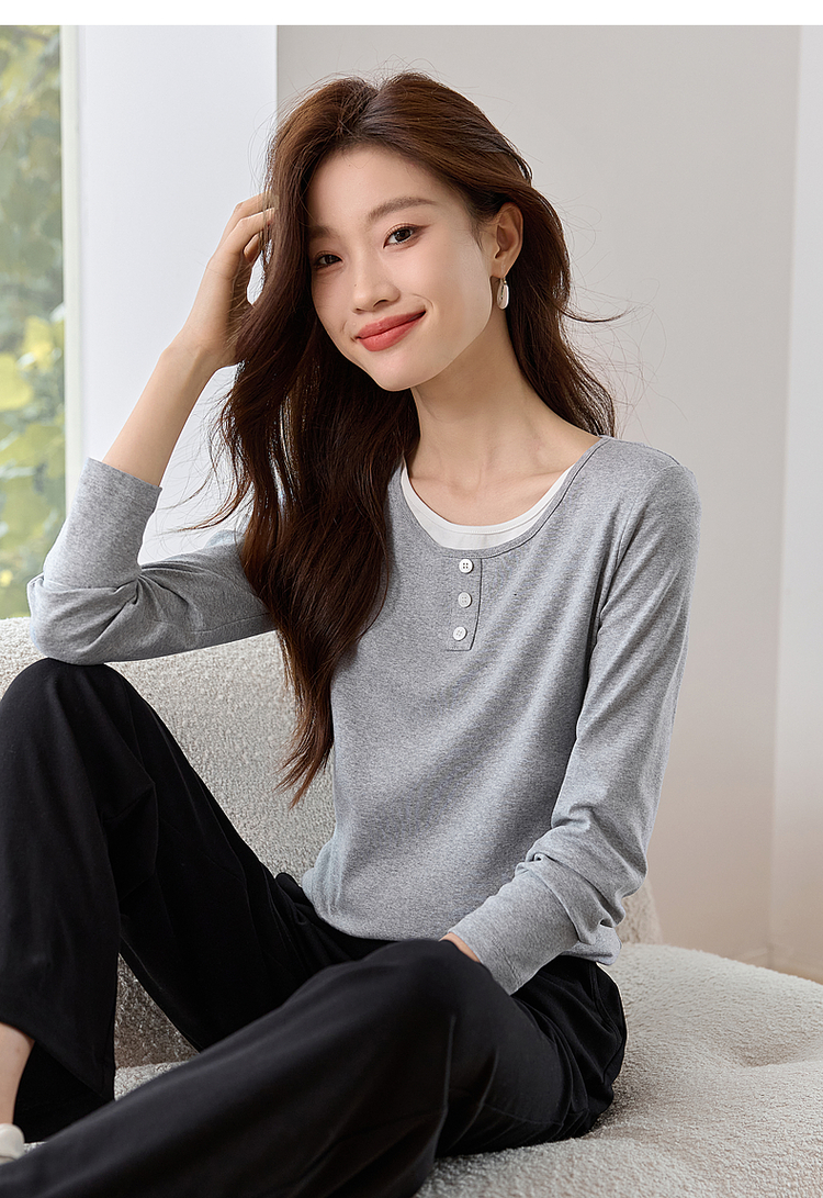 【1件71折】熙世界时髦假两件t恤长袖2025秋季修身圆领打底衫正肩显瘦上衣