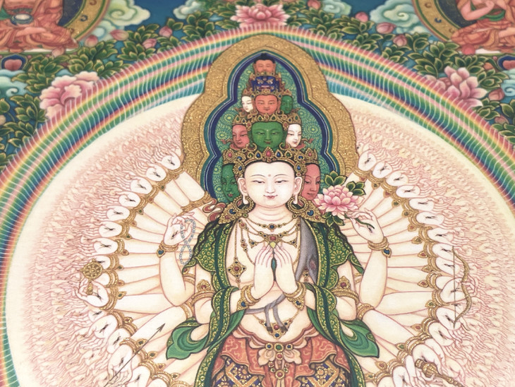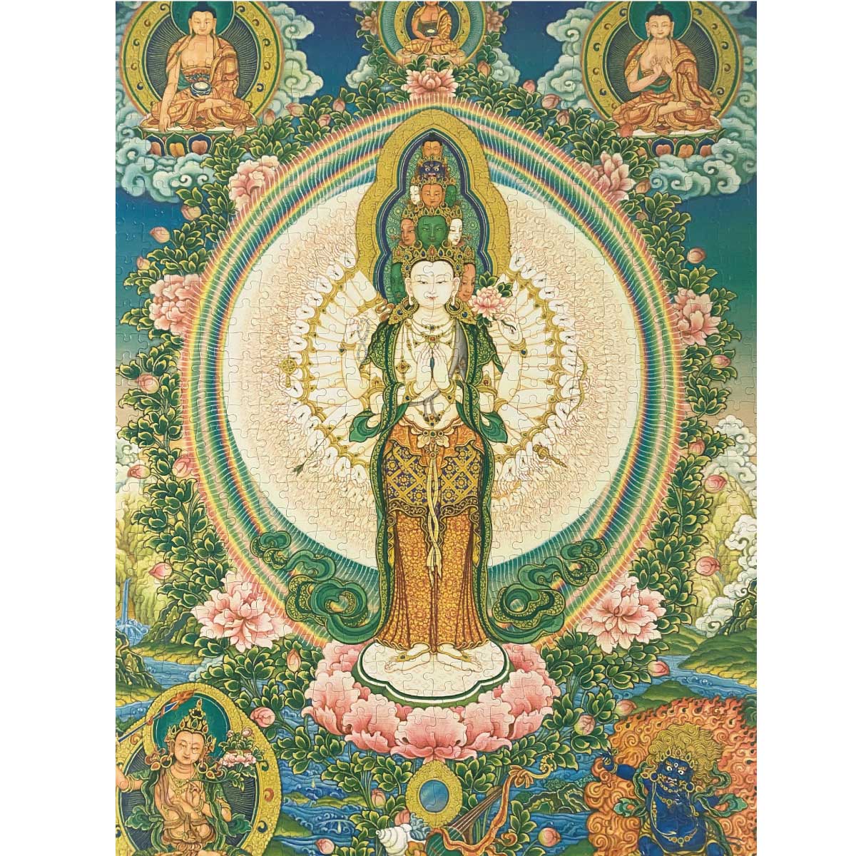 千手千眼观音,身洁白,有十一面,本面白色,右面绿色,左面红色;上列中面绿色、右面红色、左面白色;更上中面红色,右面白色,左面绿色;再上正中为黑色忿怒相;最上则为肉髻无量光佛相。上二手合掌,右手依次持佛珠、施无畏印、持轮,左手执莲花、持宝瓶执弓箭。余九百九十二手均施愿印,掌中各具一眼。身穿轻柔天衣,戴着珍宝璎珞,并足于莲花宝座中央。