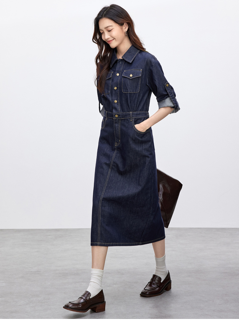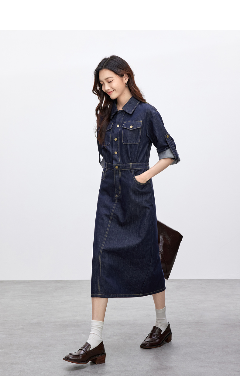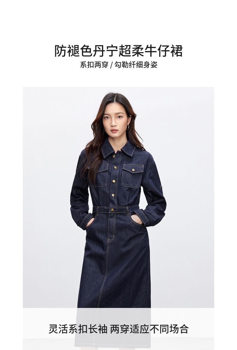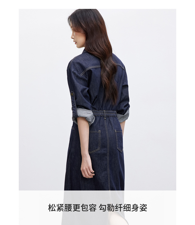 【尚都比拉】【防褪色丹宁】简约通勤翻领松紧腰明线系扣两穿超柔牛仔棉连衣裙-W51L58809
