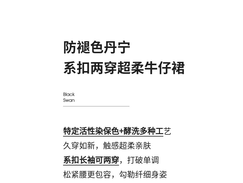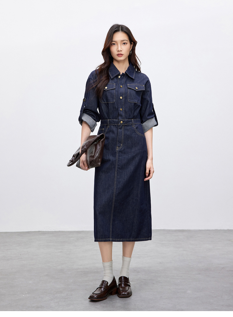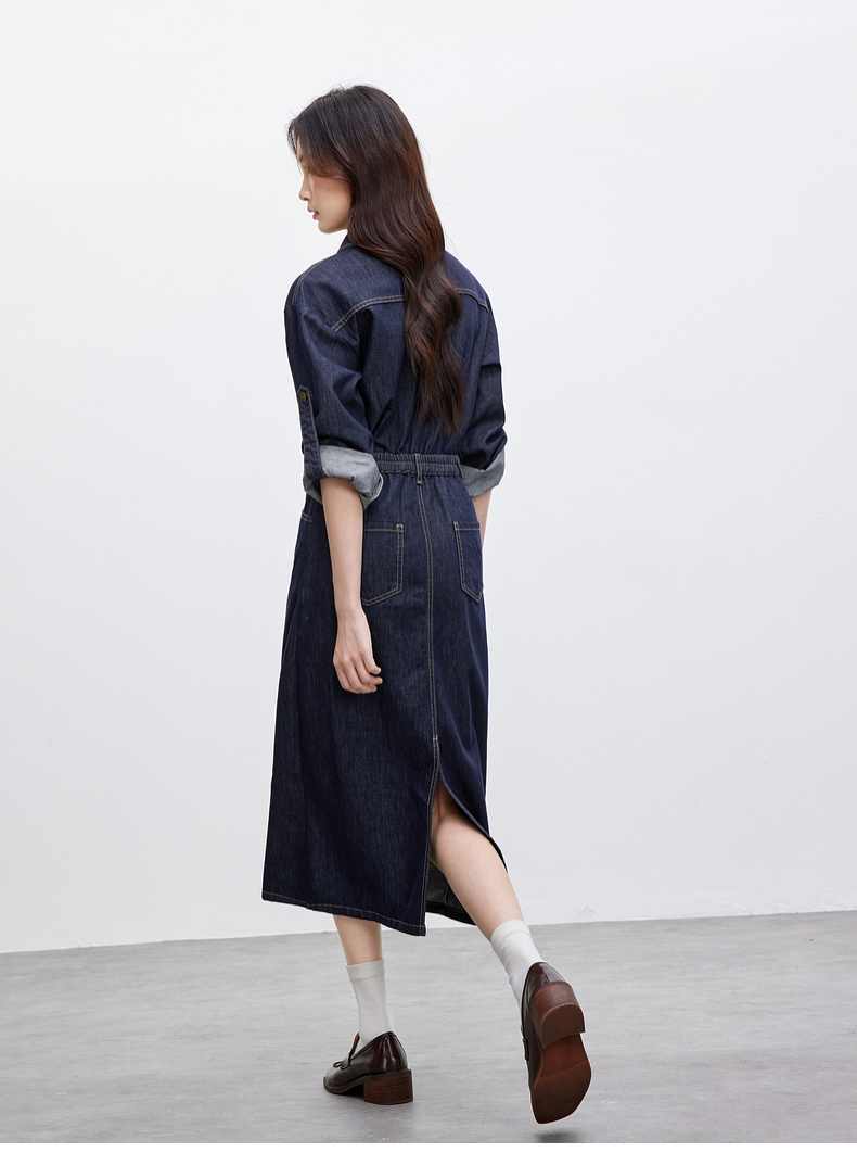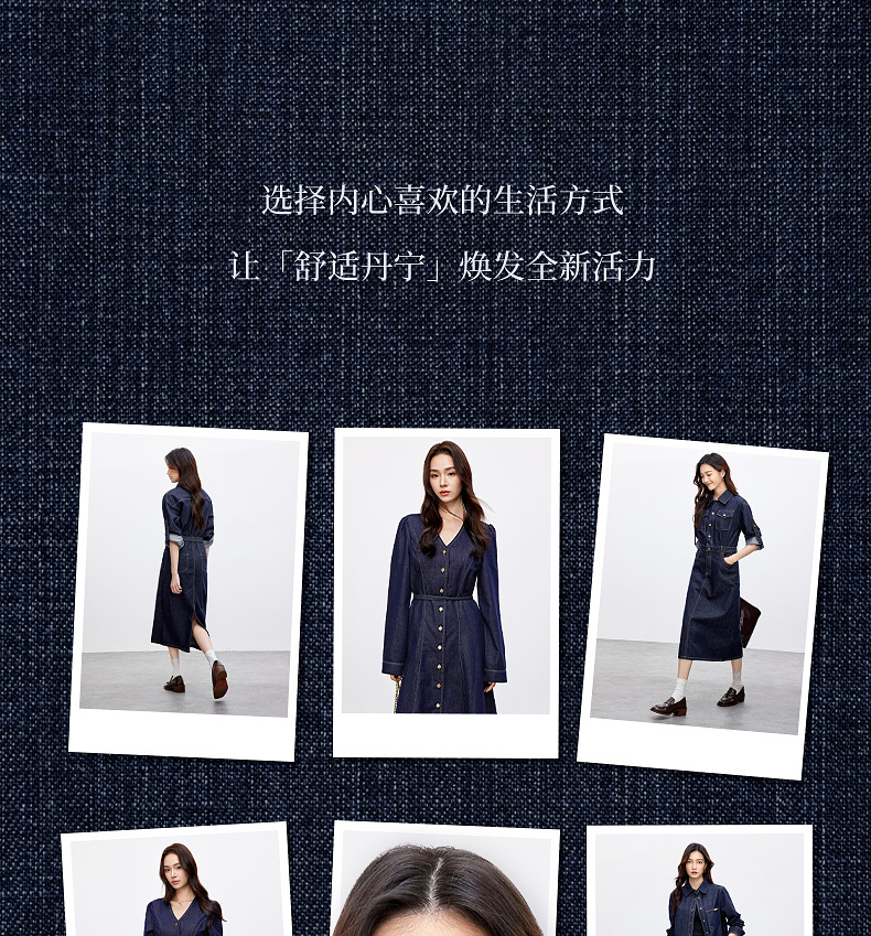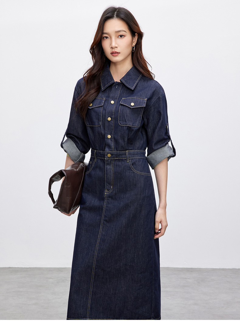 【尚都比拉】【防褪色丹宁】简约通勤翻领松紧腰明线系扣两穿超柔牛仔棉连衣裙-W51L58809