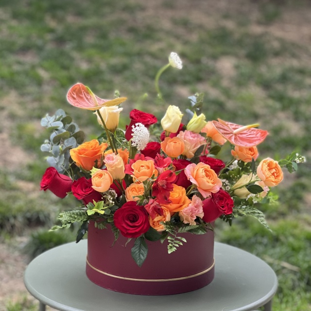 精选花材:11支红玫瑰,橘色玫瑰,橘色蔷薇,红色水仙百合,香槟色龙胆等花材混搭,红色圆形花盒
