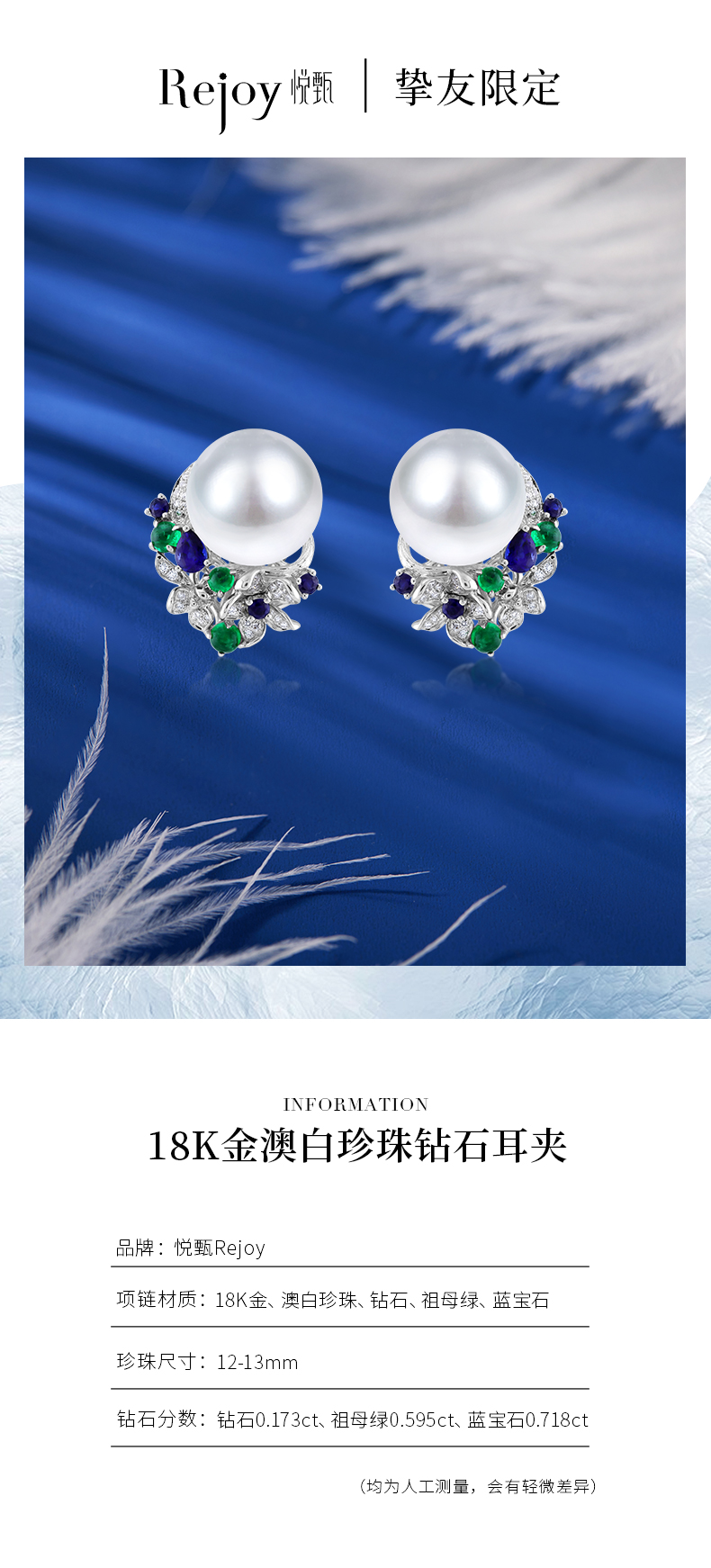 【挚友限定】 悦甄 18k金 澳白珍珠钻石彩宝耳夹 锦绣