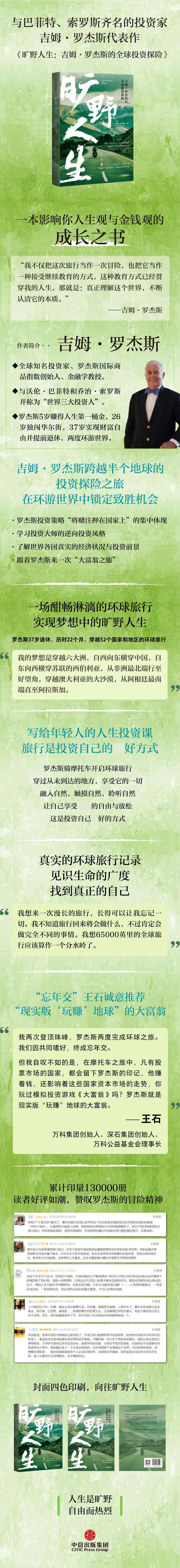 《旷野人生:吉姆·罗杰斯的全球投资探险》记录了罗杰斯在20世纪90年代的环球投资旅行。作为37岁的老背包客,这位投资大师卸下了成功者的光环,经历了旅行中的喜怒哀乐,同时也重新审视了生命的意义。 本书详述了吉姆·罗杰斯传奇的旅行经历:在中欧,他的车坠落悬崖;在西伯利亚,他经历了荒芜的挑战;在非洲,他一路逃亡;在南美,他险些遇害。同时,本书也是罗杰斯对世界投资机会的深入剖析:他记录了对沿途国家社会、政治和经济的独到见解,纠正了一些常见的误解,并对各地的投资前景进行了预测。其中,中国是罗杰斯停留时间最长的国家,他认为中国将成为一个投资的热土。 罗杰斯以其丰富的人生经历,为读者展现了巨大的投资前景,帮助投资者、商业人士以及对投资感兴趣的普通读者分析全球投资市场,发现投资金矿。