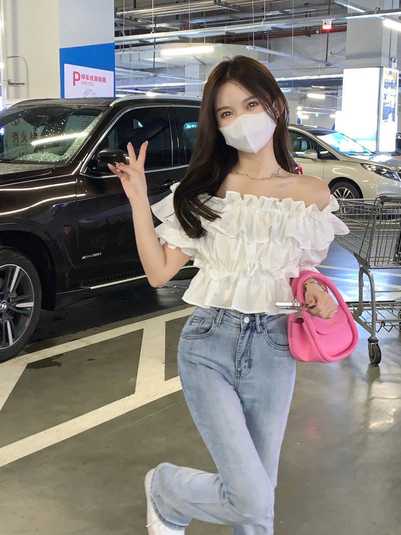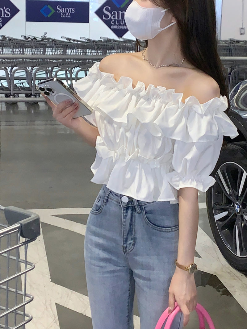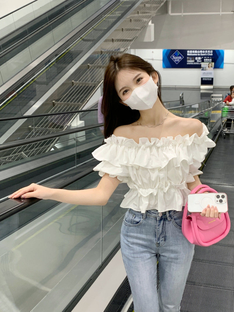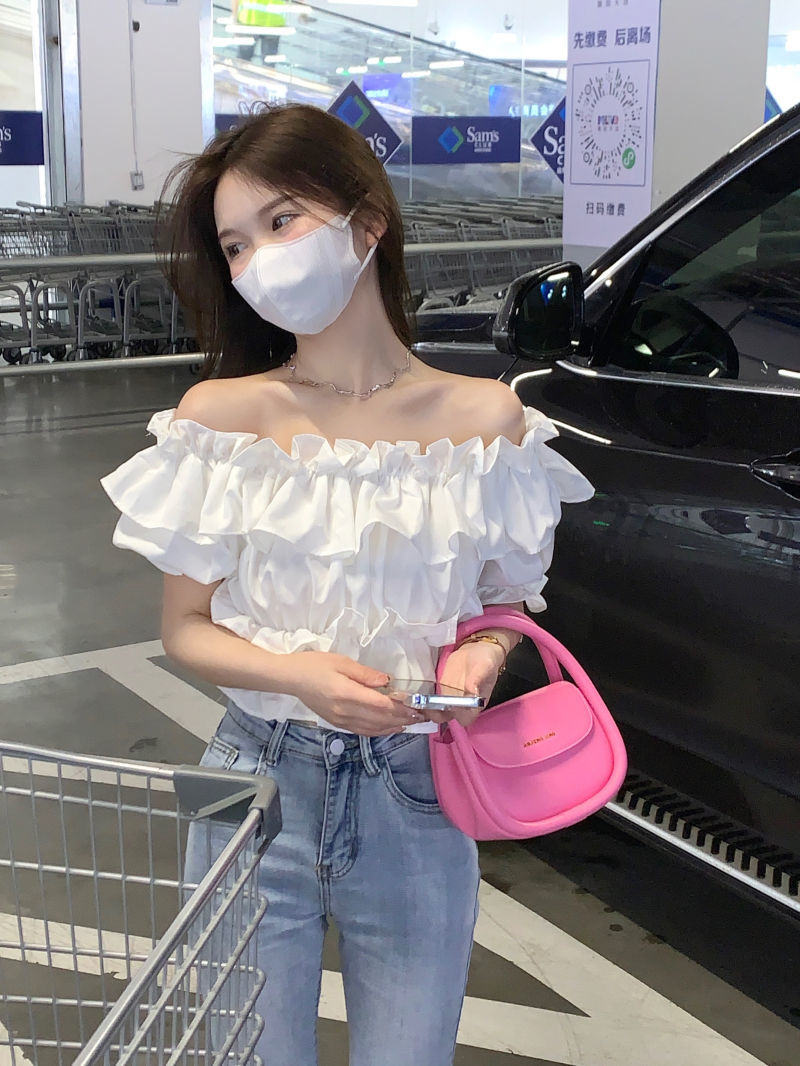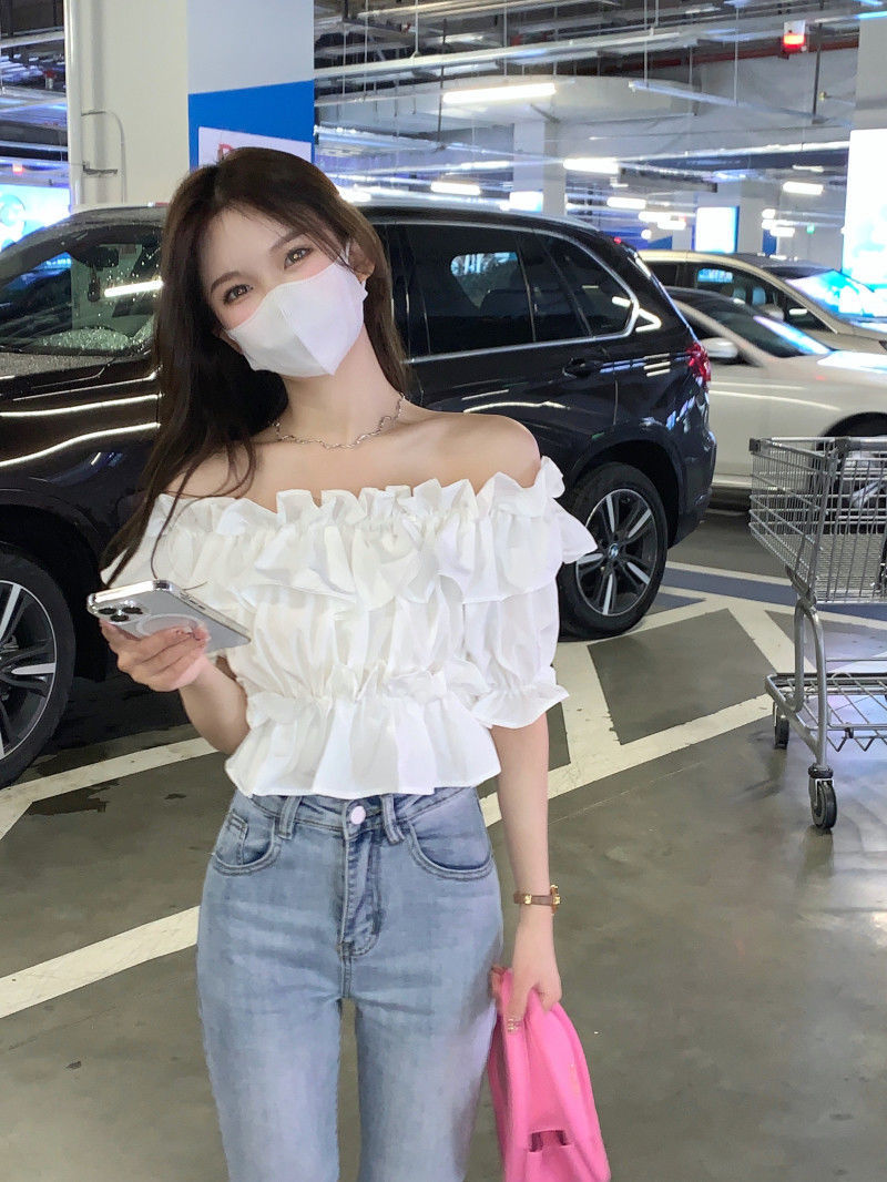 黛唯梵甜辣妹一字肩短款上衣女夏季设计感别致衬衣2022新款白色短袖衬衫国庆出游