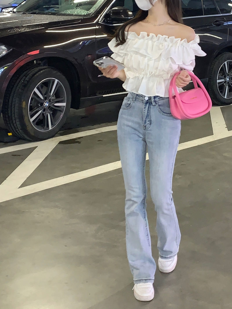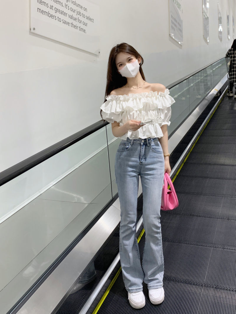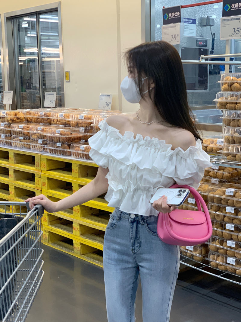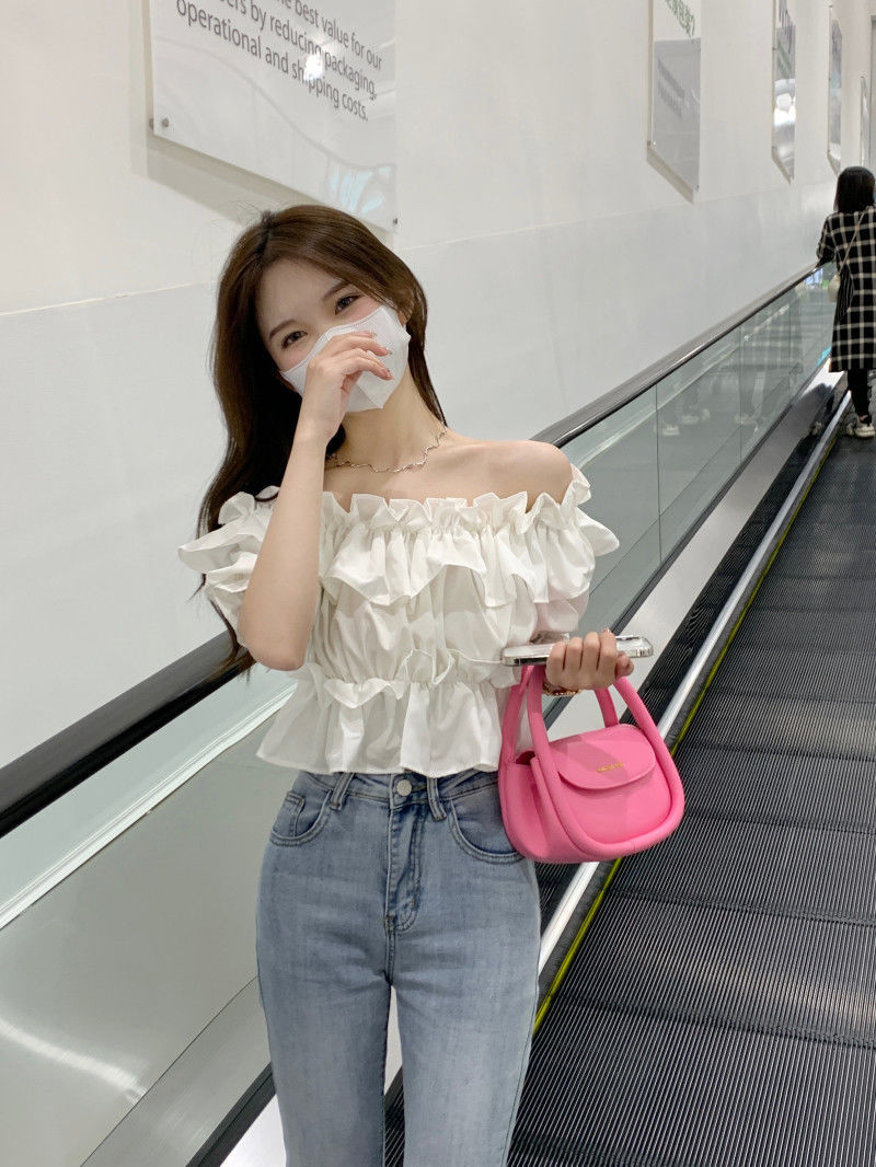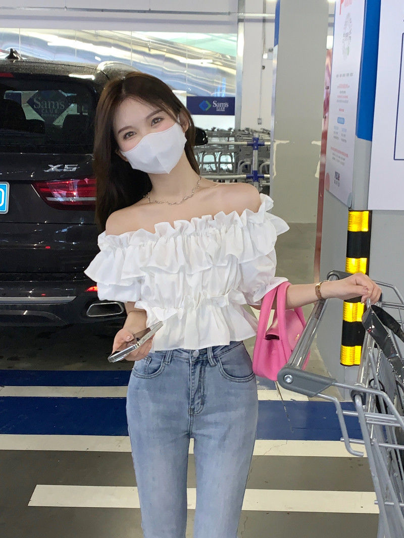 黛唯梵甜辣妹一字肩短款上衣女夏季设计感别致衬衣2022新款白色短袖衬衫国庆出游
