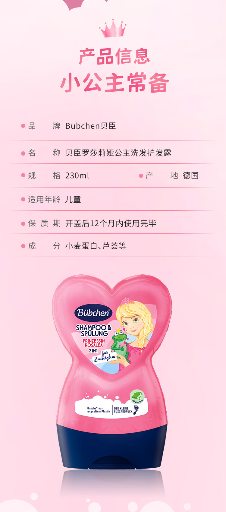 贝臣罗莎莉娅公主洗发护发露230ml/118013 甜甜果香柔顺不打结