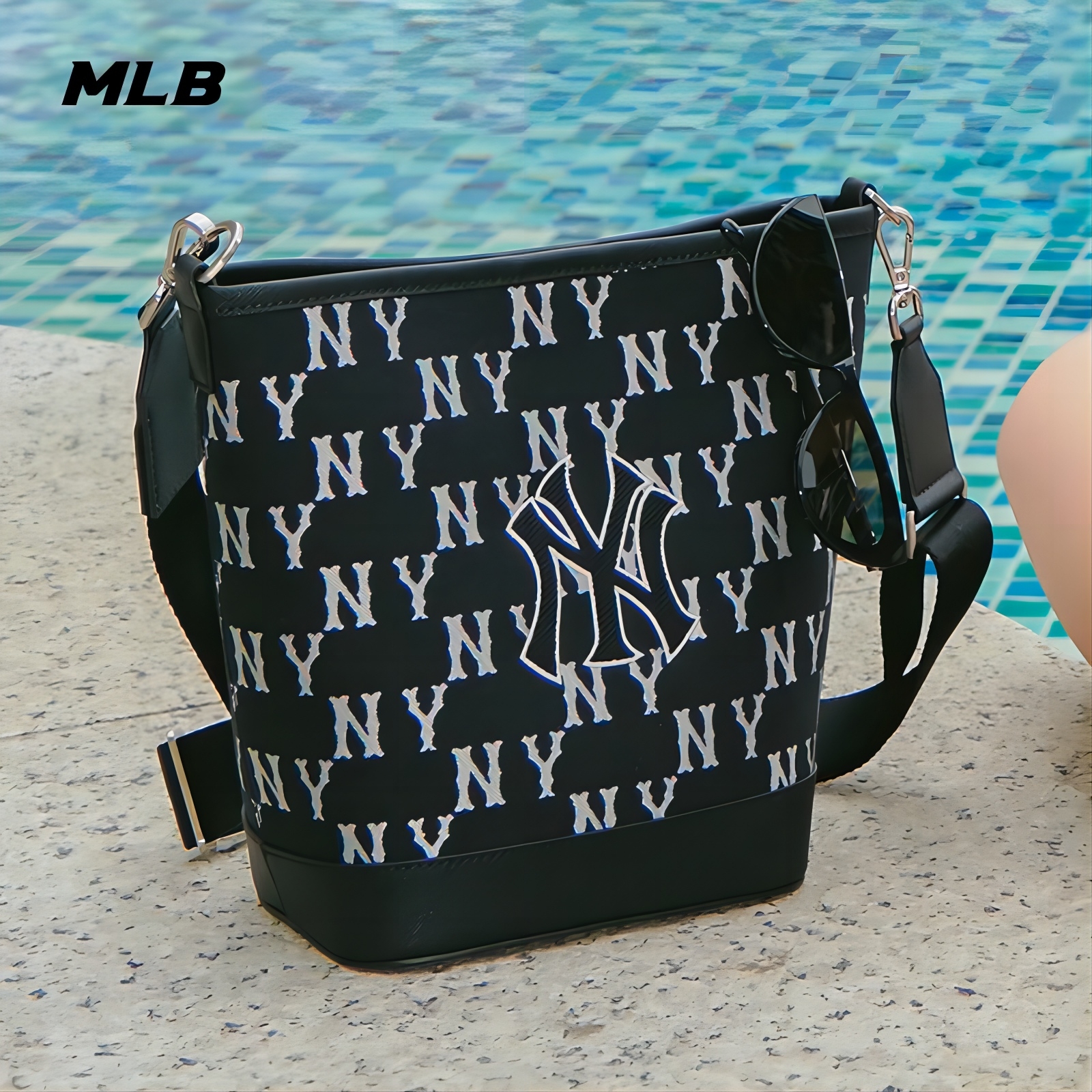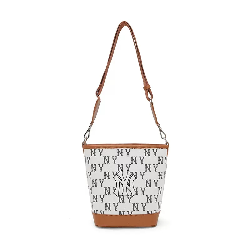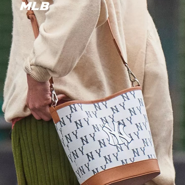 【品牌授权】扫码验证 韩国MLB复古老花水桶包-奶油色 米色 黑色 女新款老花满印休闲时尚 3ABML023N
