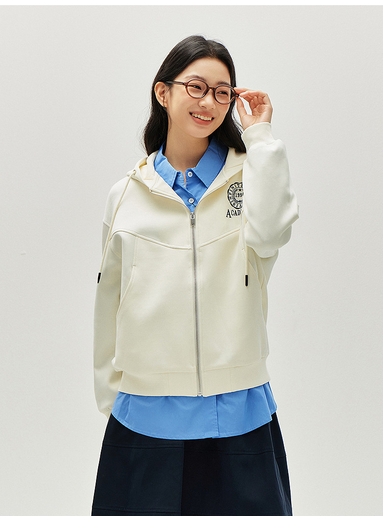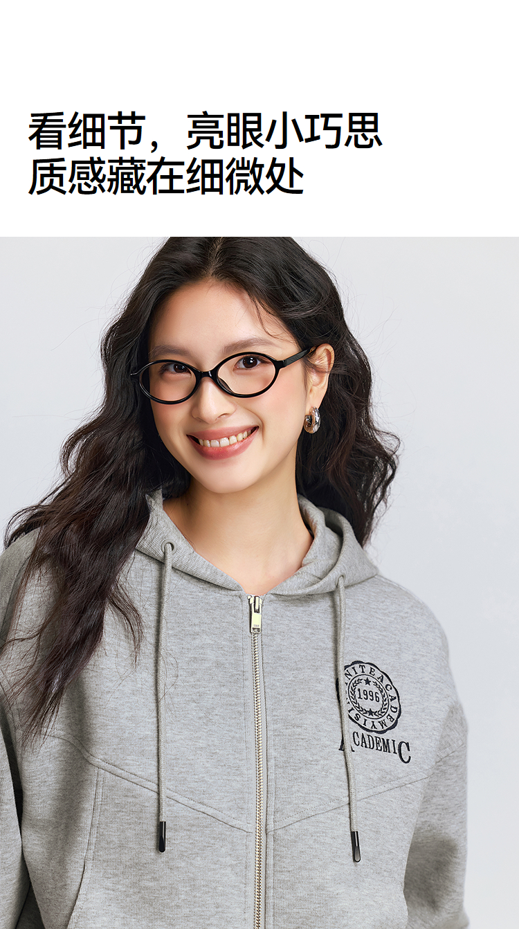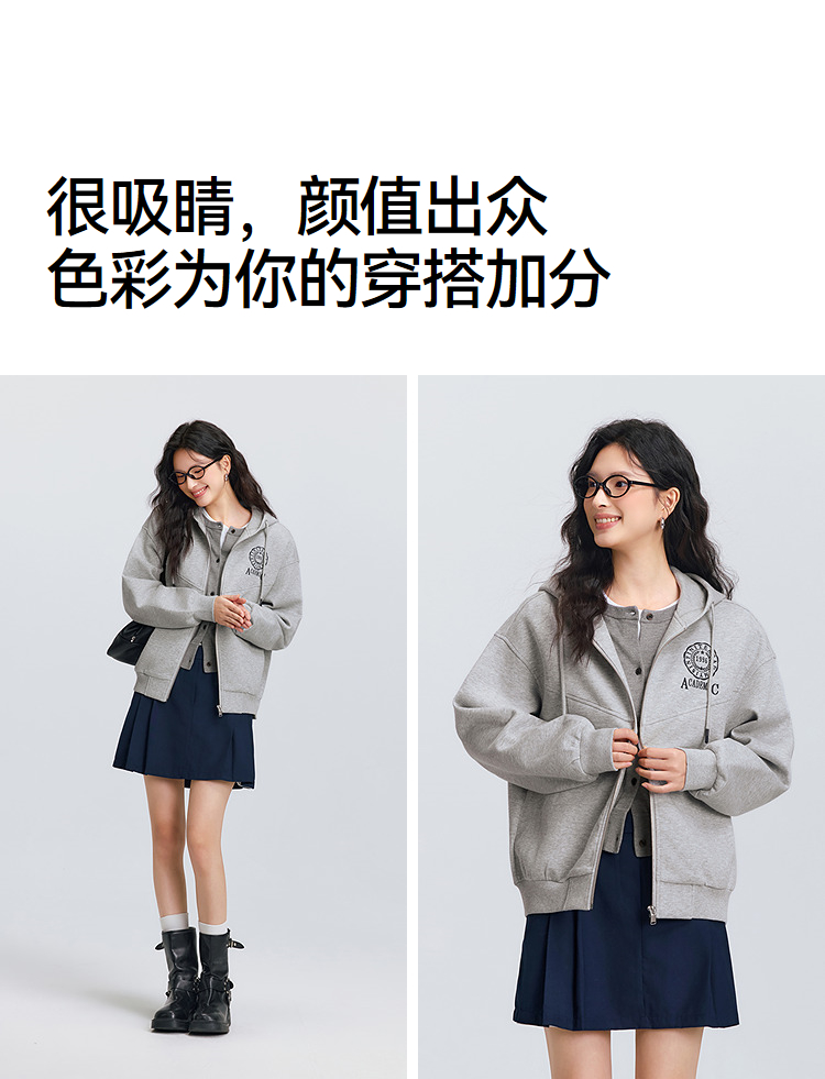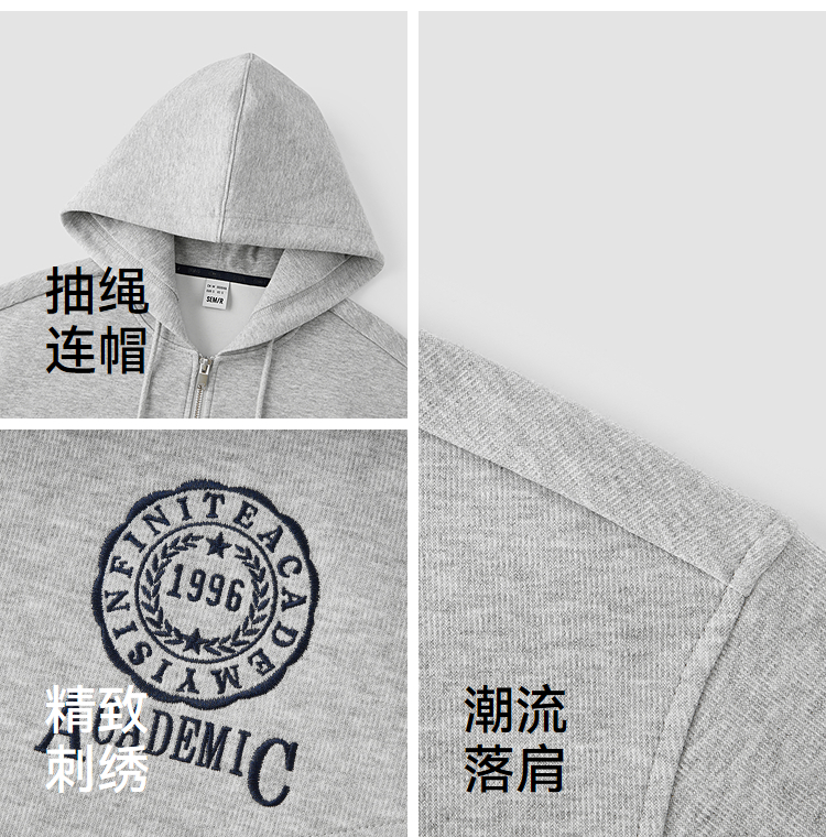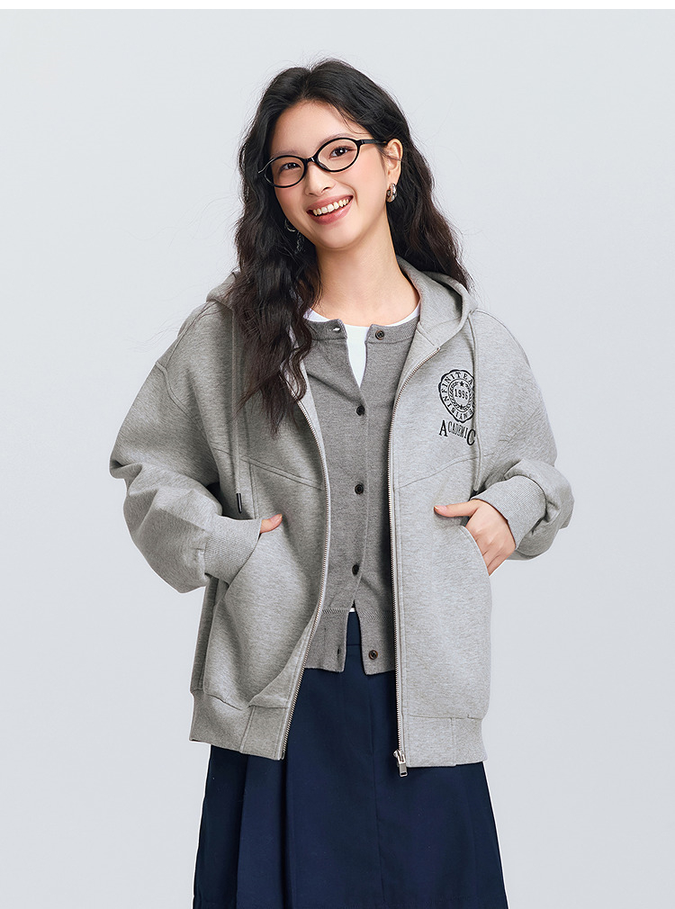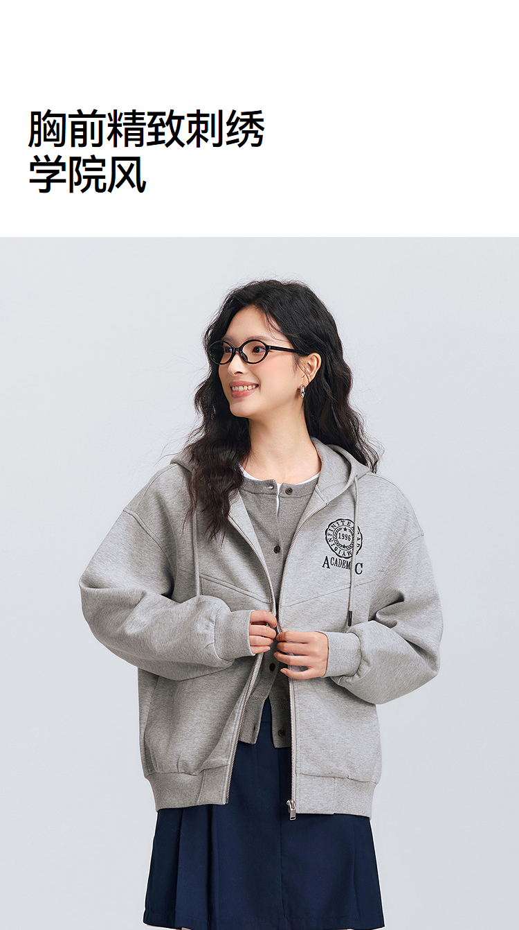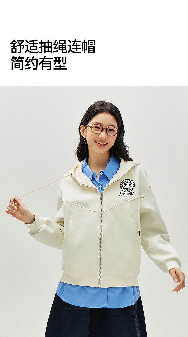 森马外套女春季连帽字母刺绣宽松落肩质感夹克分割气质学院风上衣