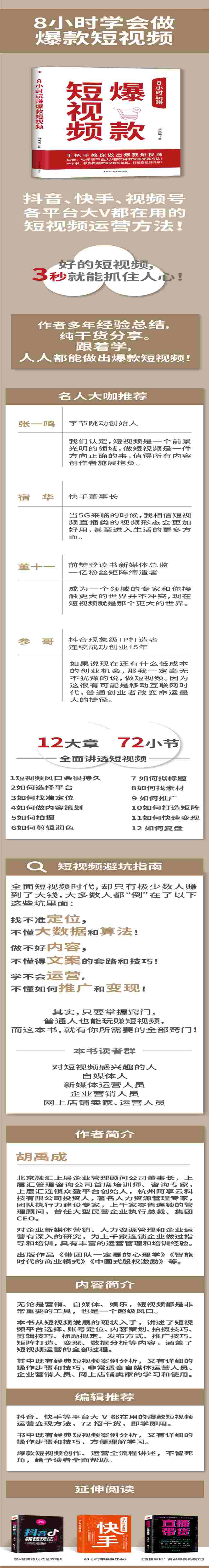 本书以深入浅出的方式呈现短视频精细化运作的每一个细节,既适合个人和团队短视频创作者阅读,也适合希望借助短视频实现私域引流和商业变现的企业、品牌和商家阅读,精准涨粉、引流变现、运营干货,8小时即学即用,让短视频起号变现更简单!