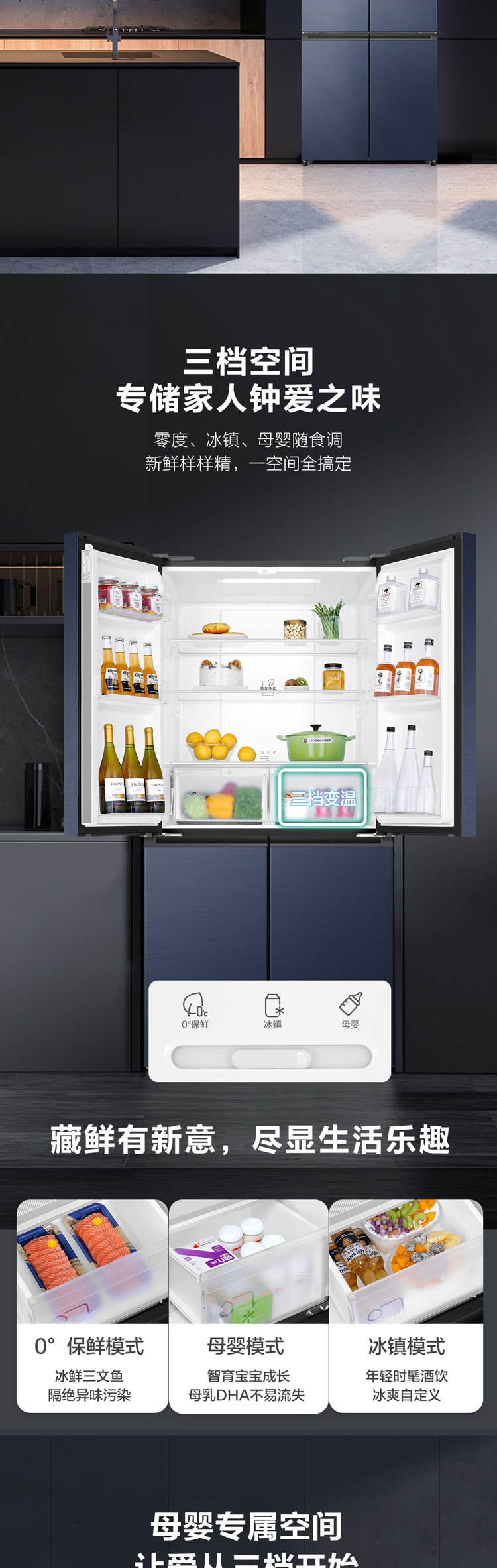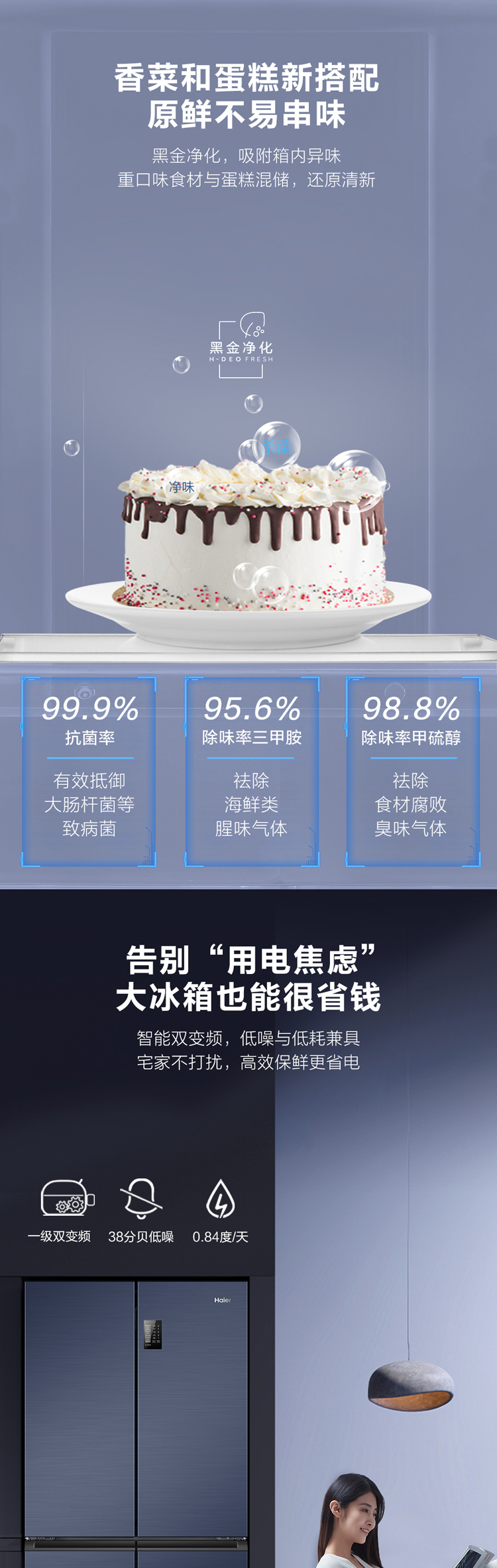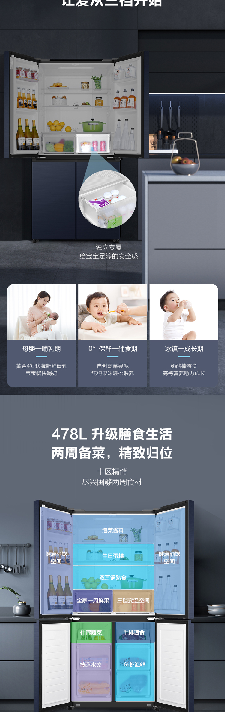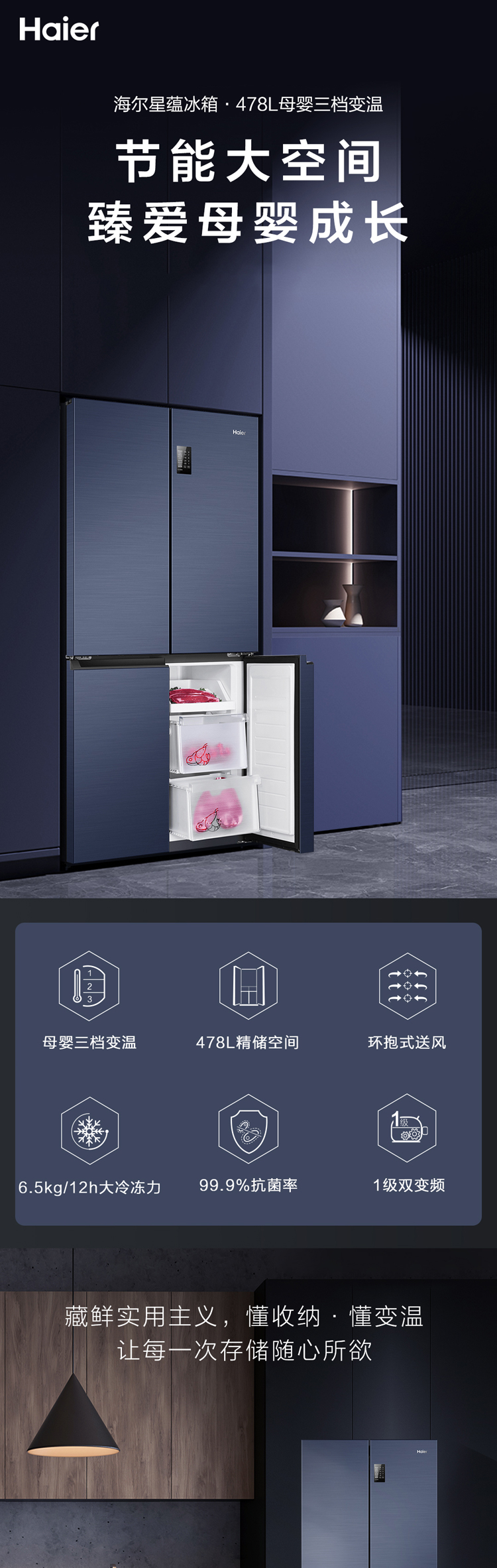 海尔478升 无霜变频 十字对开 四开门 母婴三档变温 黑金净化超薄 冰箱 一级能效 超大容量BCD-478WGHTD5DB9
