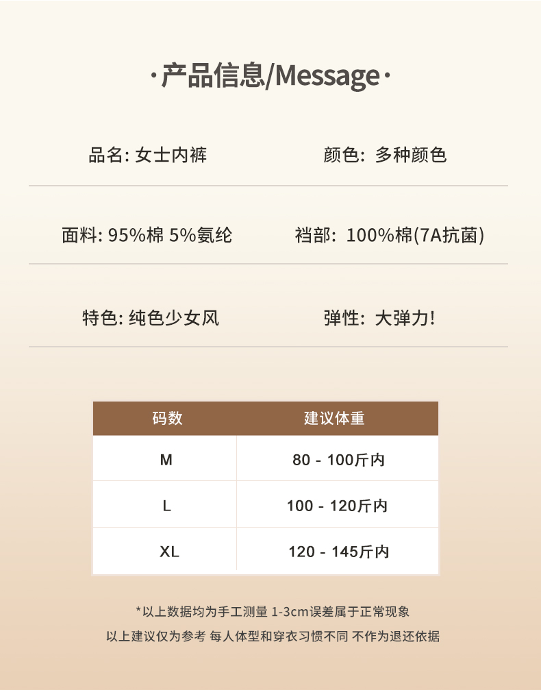 【材质】面料:95%棉,5%氨纶;裆部:100%棉