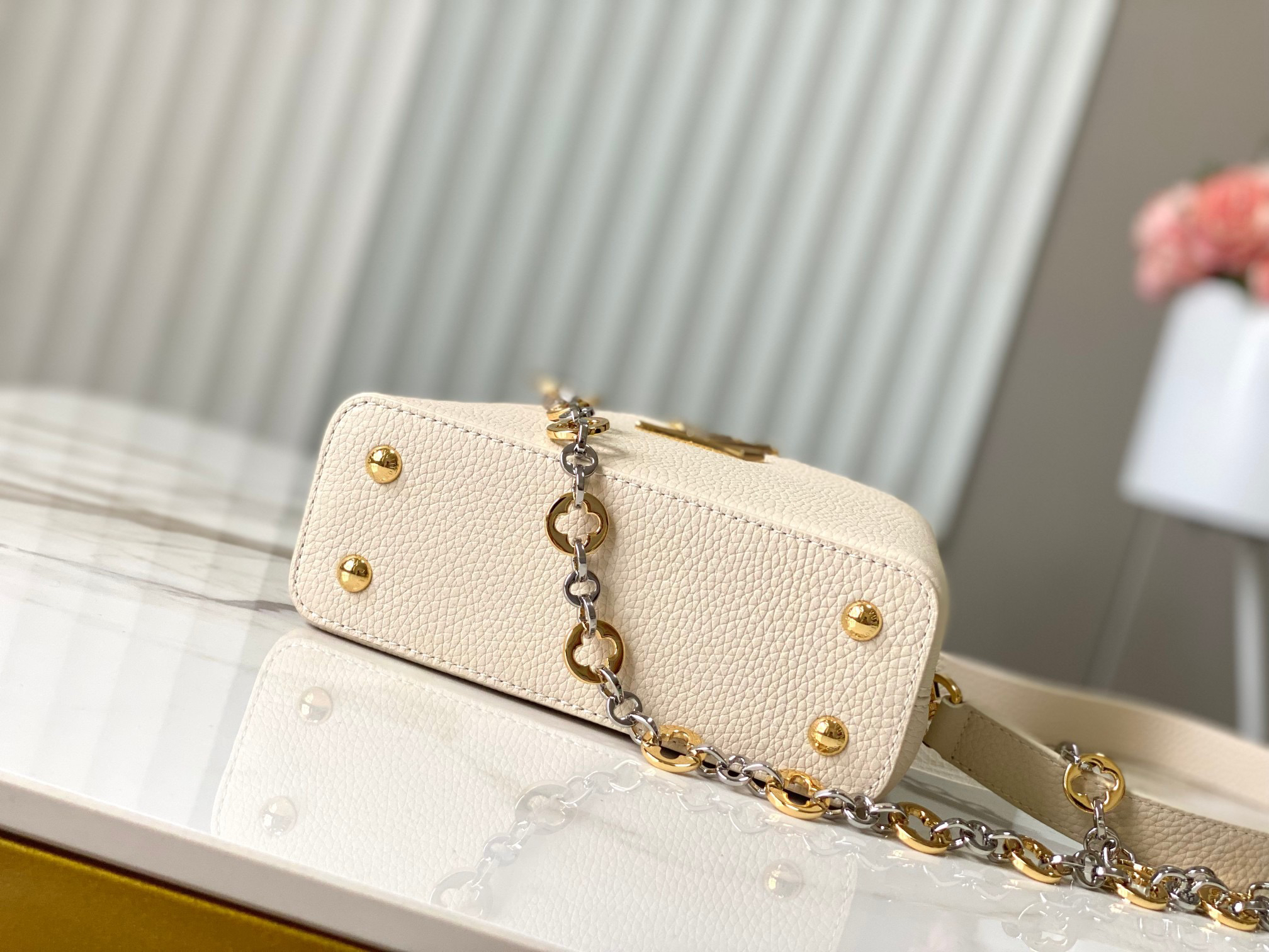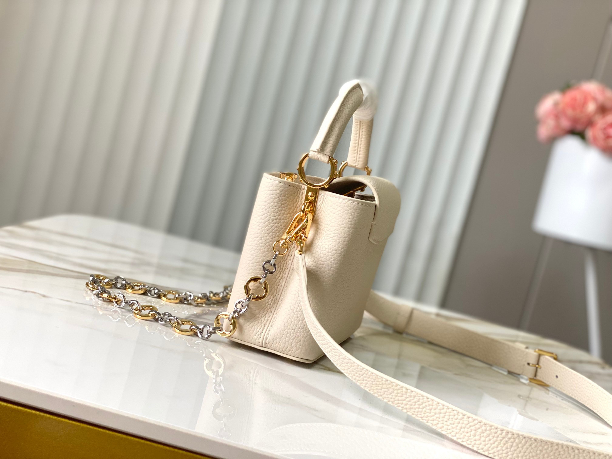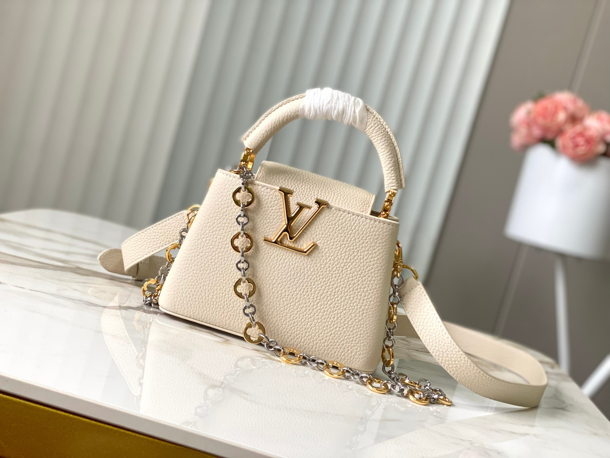 秋冬特惠💰1650 渠道级LV 新品 te级LV 动态芯片 M12938/M48865奶白圆花环扣款 本款Capucines 手袋取材柔韧Taurillon 牛皮革 以珠宝风格双镀链条和 Monogram花卉元素点明Chain On You系列身份 翻盖可置于内外两侧 充裕构型和多重内袋方便收纳日常所需 圆润LV字母再添匠心细节 Size: 21 * 14 * 8 cm