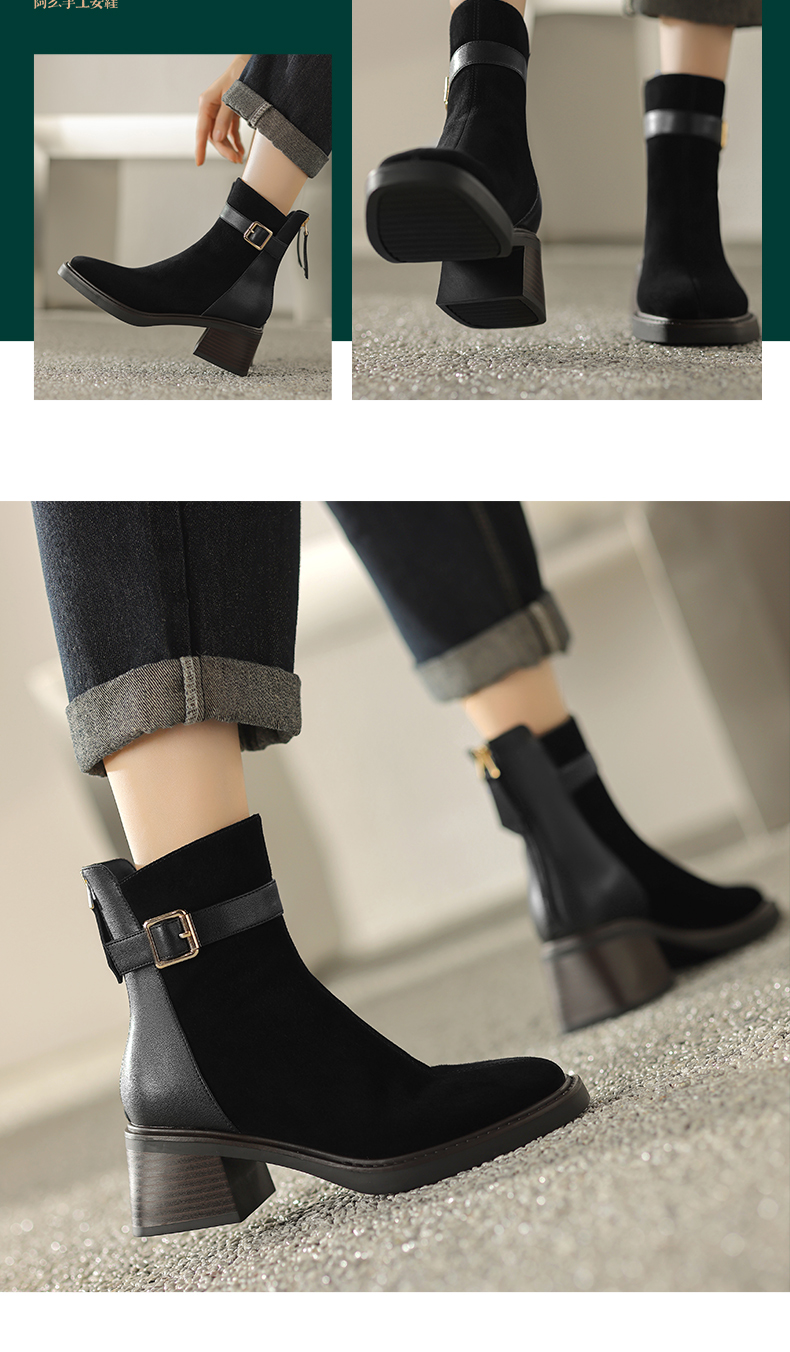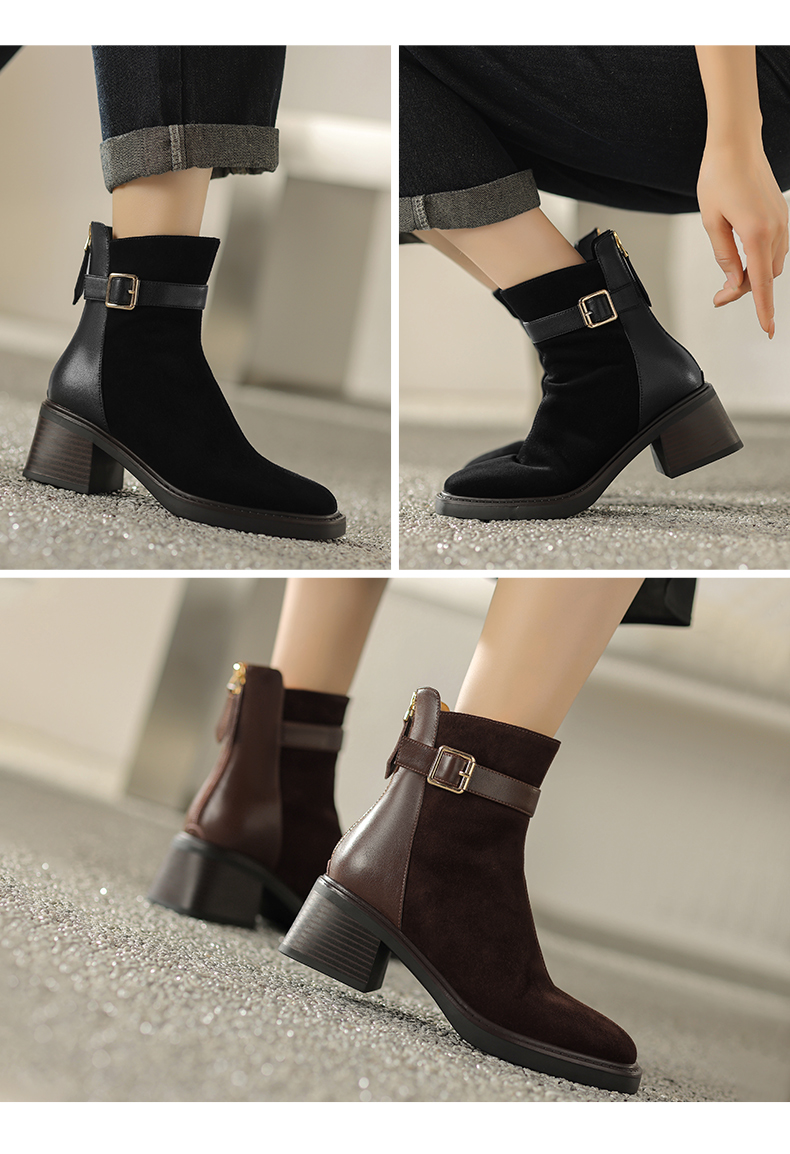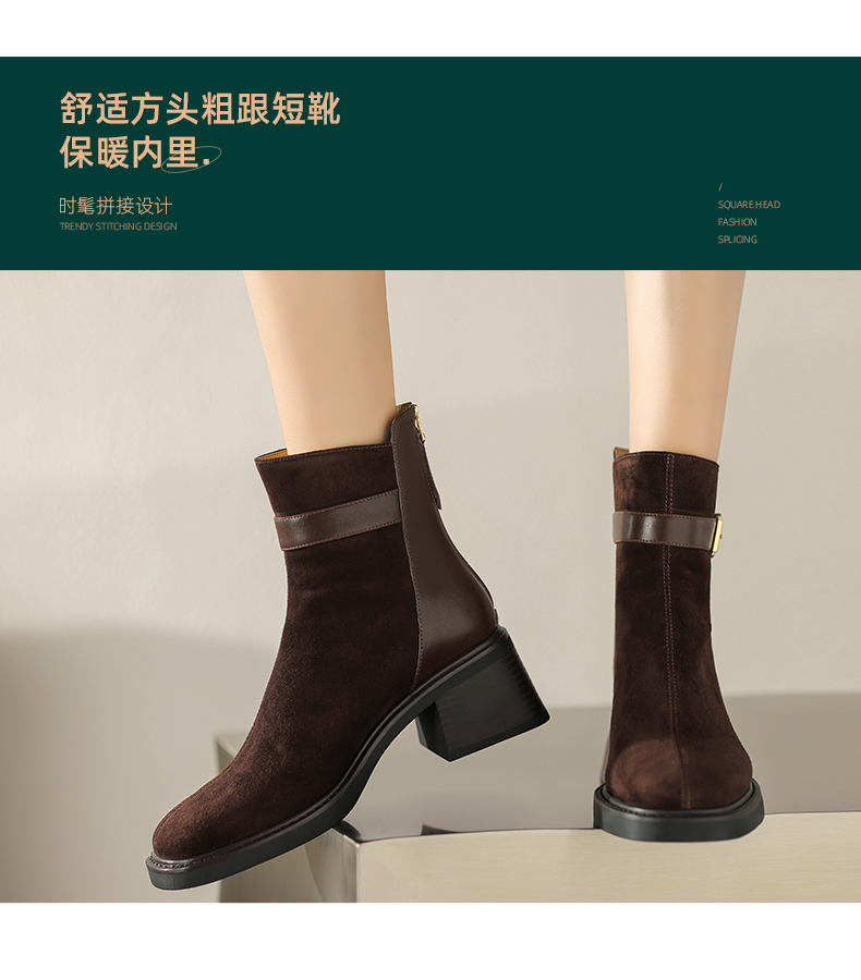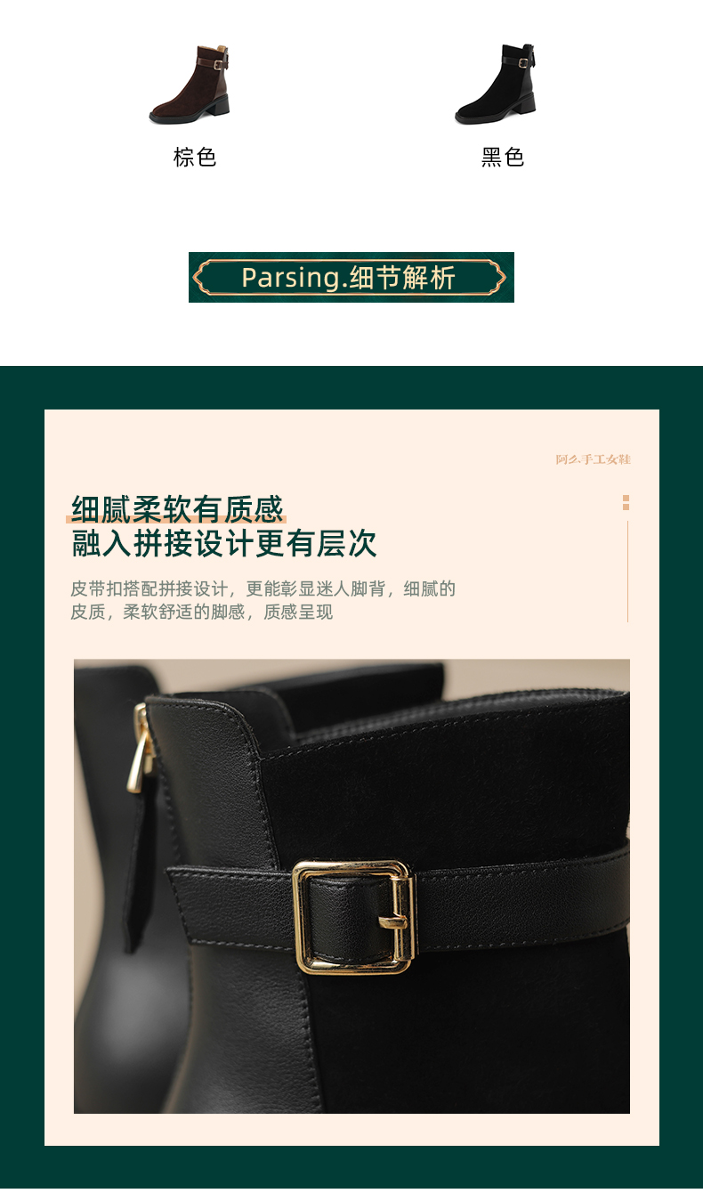 阿么手工女鞋冬季新款拼接真皮短靴复古粗跟5CM时尚英伦风靴子女