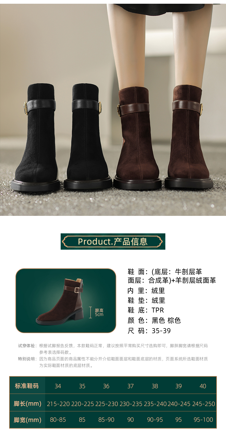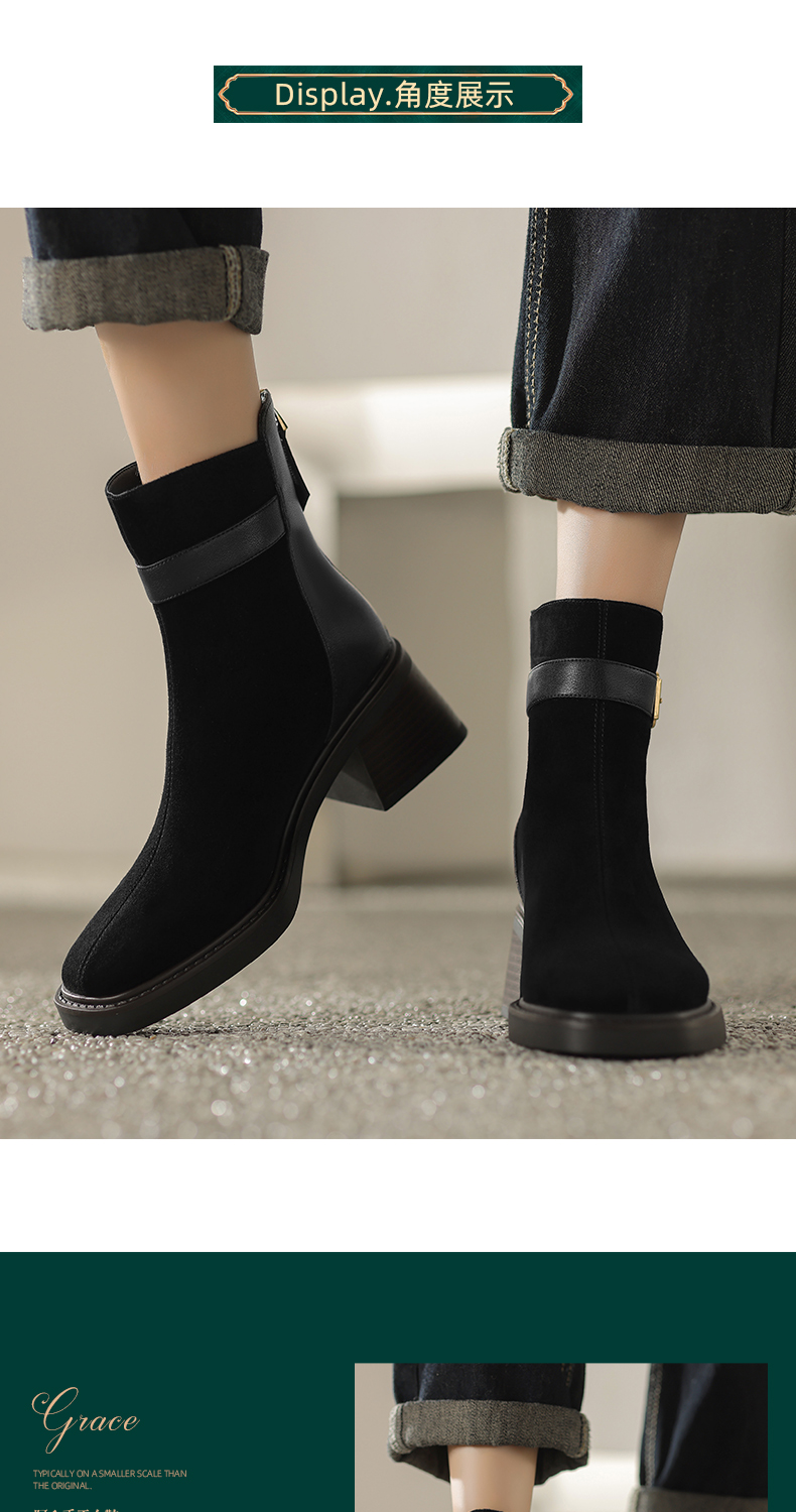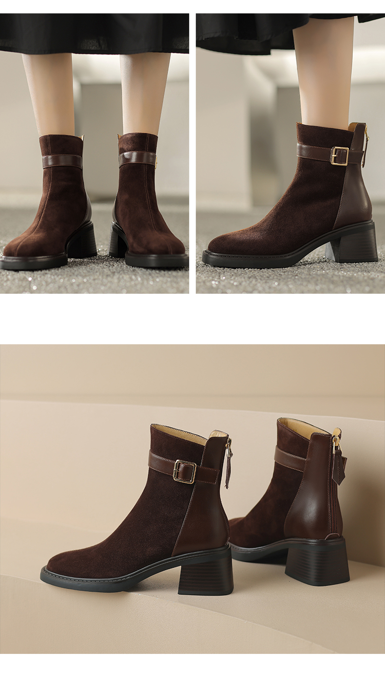 阿么手工女鞋冬季新款拼接真皮短靴复古粗跟5CM时尚英伦风靴子女
