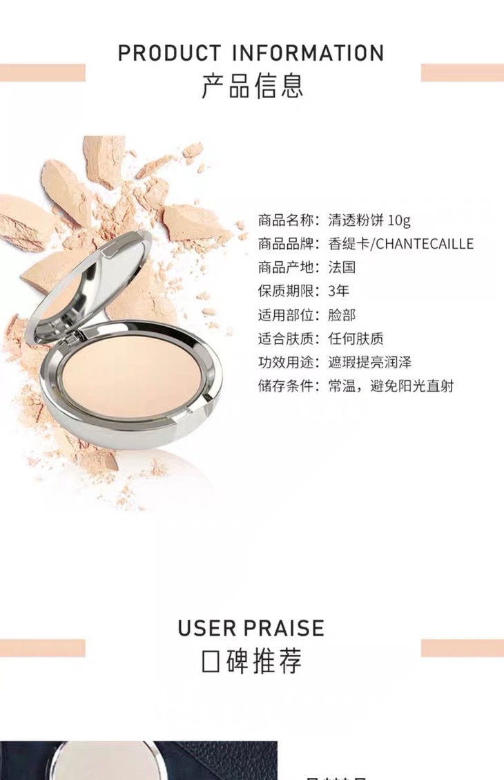 1、产品名称:法国香缇卡清透粉饼
