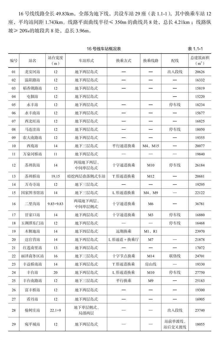 全书共分4章,第1章概述,介绍了16号线背景、促进城市发展的作用、主要技术标准及设计创新内容;第2章创新设计理念,阐述了指导16号线全过程设计的“高服务水平定标准、标准化设计增高效、精细化设计控投资、研究型设计解难题、城市化设计铸精品” 创新理念内涵;第3章高效总体总包设计管理与服务,介绍了16号线总体总部管理的核心内容、高效方法及全方位服务要点;第4章设计关键技术,分为线路、行车组织、建筑、结构与防水、设备系统、车辆基地及工程经济等各专业设计关键技术内容及总结思考。