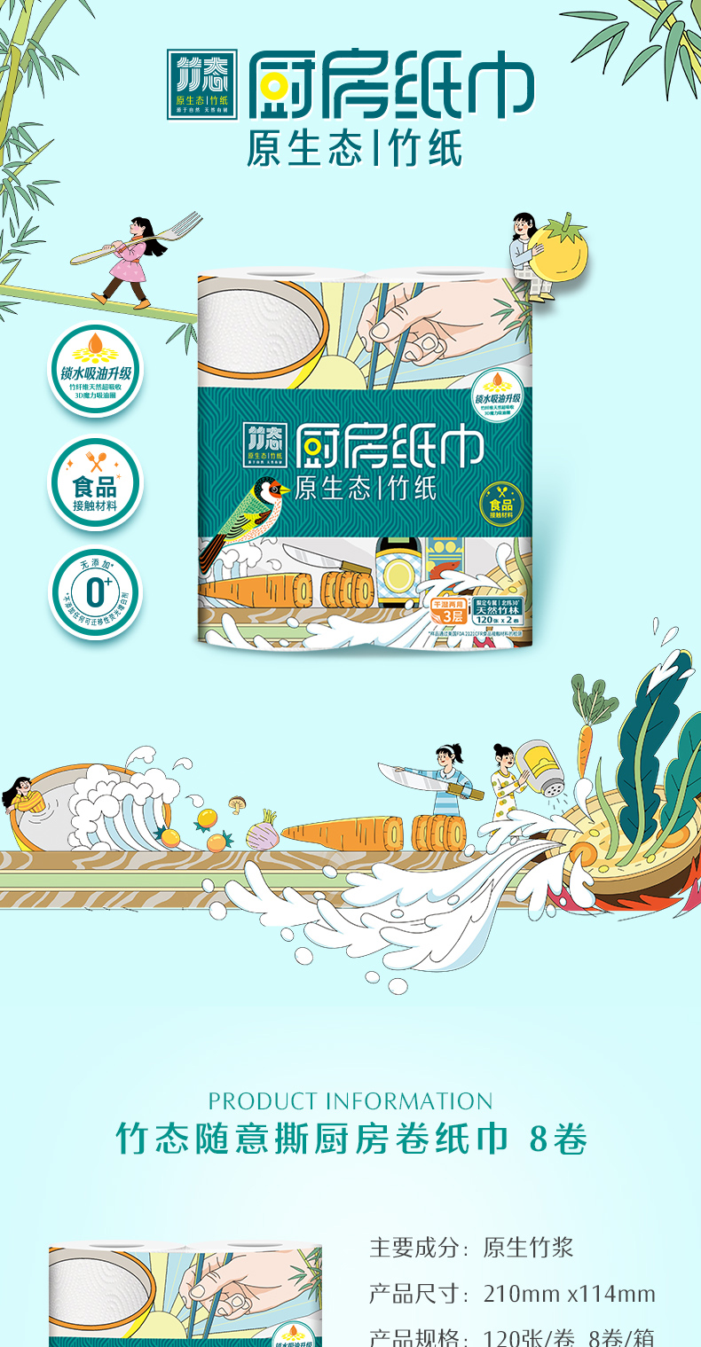 竹态厨房纸巾3层厚*120节*8卷量贩装