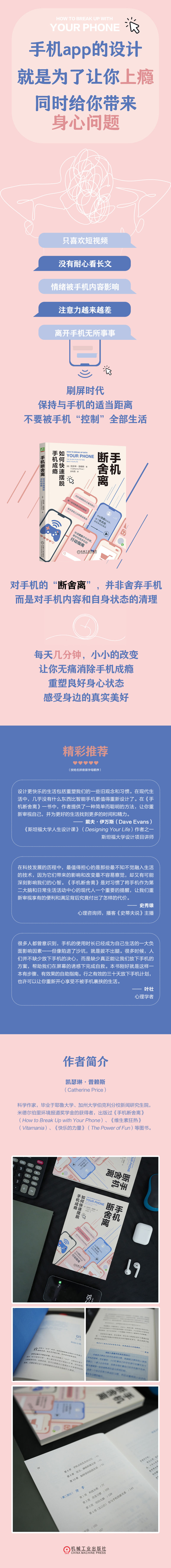 你早起的第一件事和睡前最后一件事是看手机吗?你是否经常拿起它“只是为了看一下有没有信息”,回过神来却是45分钟后了,你也很想知道时间都到哪里去了。你是否想少花点时间在手机上,但又不知道如何在不放弃手机的情况下做到这一点?如果是这样,这本书就是你的解决方案。 作者提出了一个实用的、易操作的“分手”计划——然后再和手机“和好”。我们的目标是什么?是一段让你感觉良好的长期关系。在本书中,你会发现手机和应用程序是如何让人上瘾的,并了解花在手机上的时间如何损害了我们的注意力、深度思考和形成新记忆的能力。然后,你将对你的手机设置、应用程序和自己的心态进行自定义更改,zui终做到能够重新掌控自己的生活。