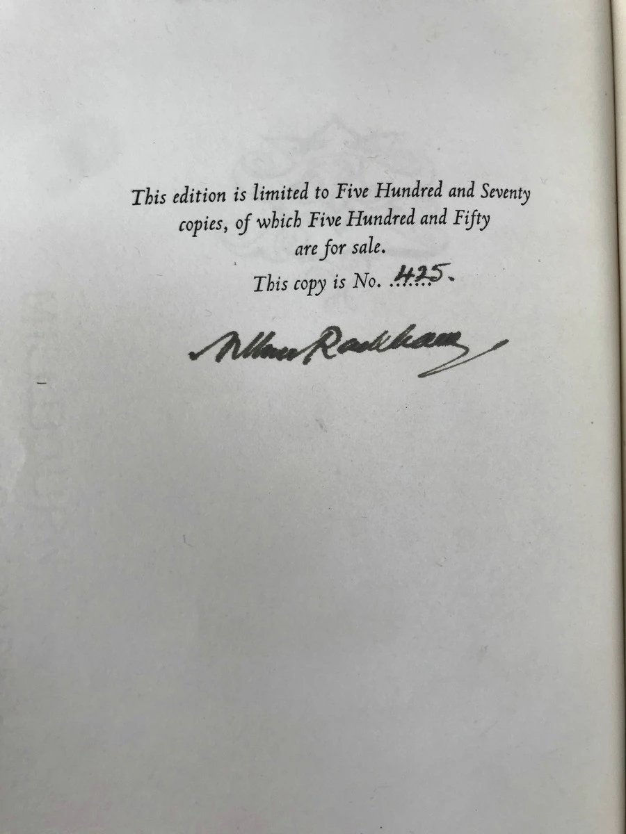 本书为仅发行570册的限量版图书,编425号,卷首有限量标示,以及画家亚瑟·拉克姆的亲笔签名