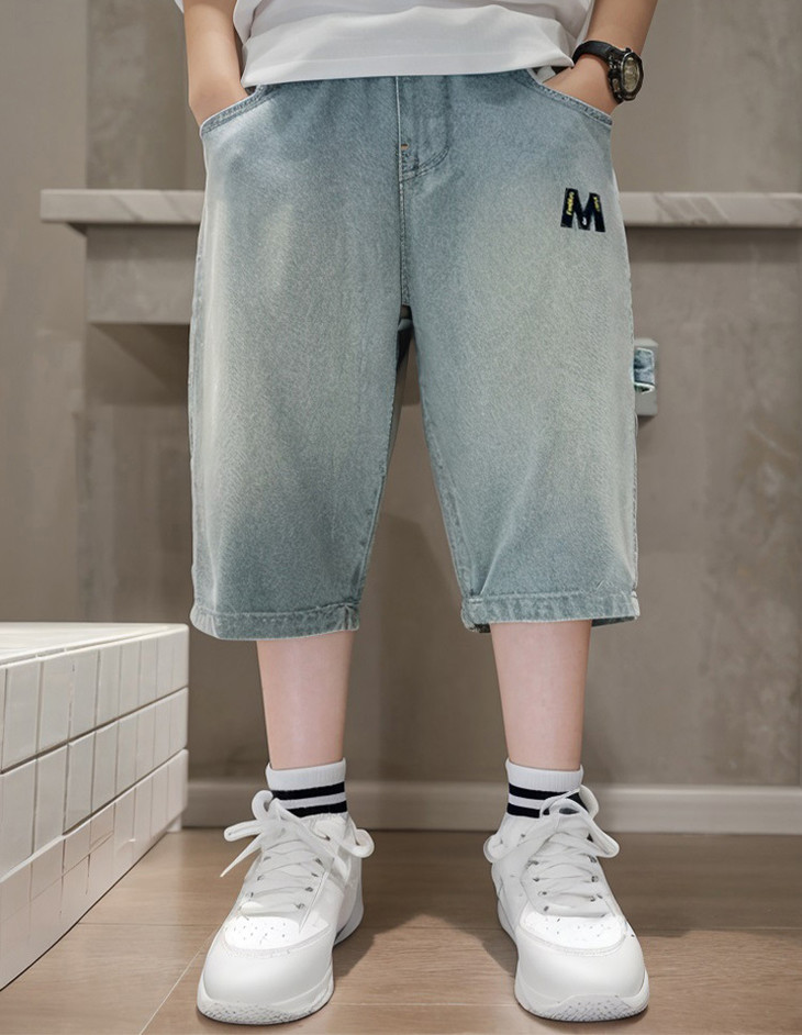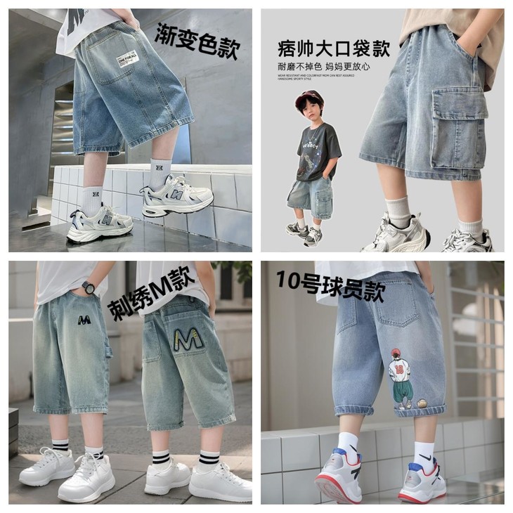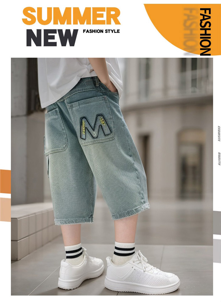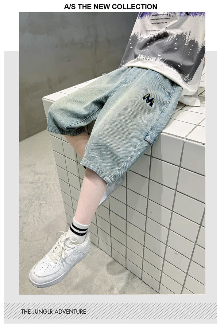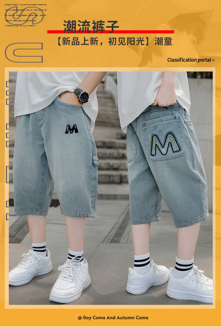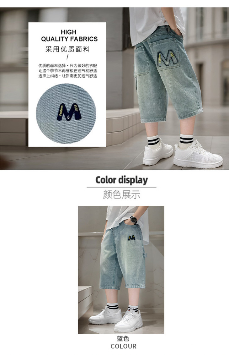 第三款 潮流M字母牛仔短裤 🌟潮流外观 独特字母刺绣:裤子上超酷的 “M” 字母刺绣,个性又吸睛,瞬间提升时尚感,宝贝穿上就是街头最靓的仔😎。 宽松版型:宽松的剪裁,不紧绷、不束缚,走路带风,痞帅范儿十足,舒适与时尚完美兼得。 🎈优质面料 精选优质牛仔面料,透气又柔软,夏天穿着不闷热,给宝贝肌肤温柔呵护🥰。而且微弹的特性,让宝贝活动自如,跑跑跳跳无压力~