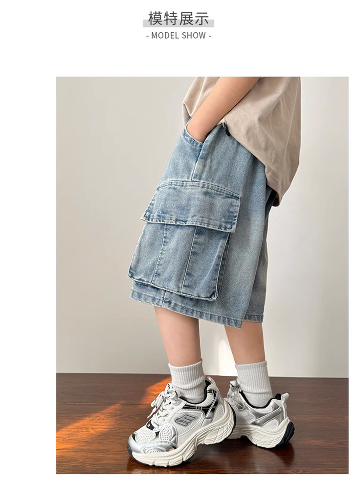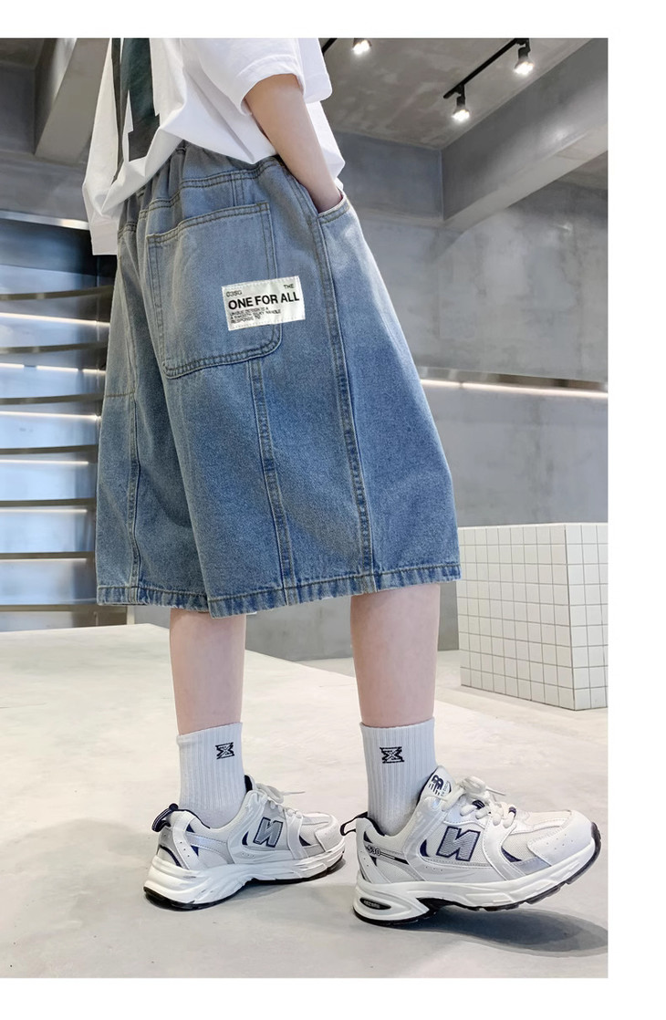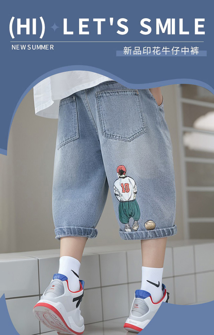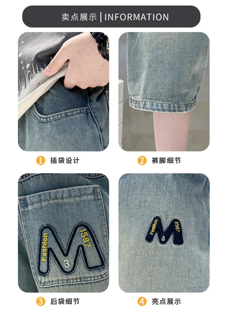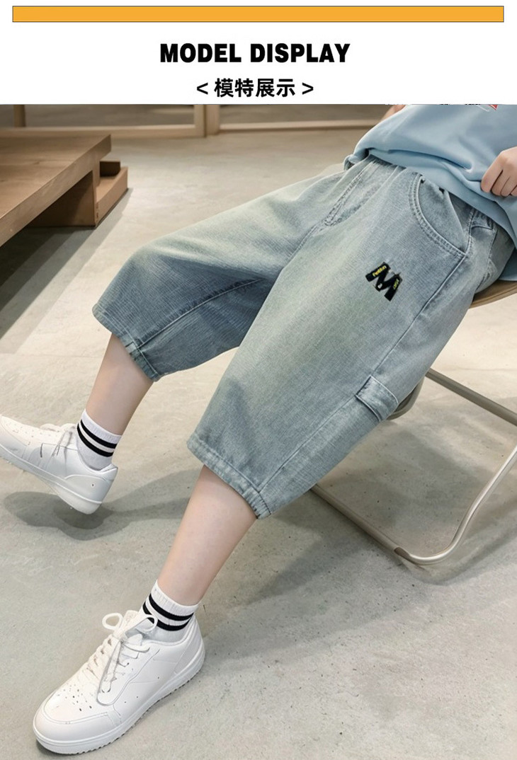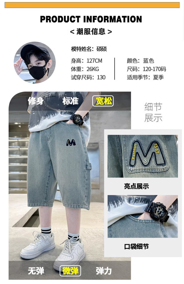 第三款 潮流M字母牛仔短裤 🌟潮流外观 独特字母刺绣:裤子上超酷的 “M” 字母刺绣,个性又吸睛,瞬间提升时尚感,宝贝穿上就是街头最靓的仔😎。 宽松版型:宽松的剪裁,不紧绷、不束缚,走路带风,痞帅范儿十足,舒适与时尚完美兼得。 🎈优质面料 精选优质牛仔面料,透气又柔软,夏天穿着不闷热,给宝贝肌肤温柔呵护🥰。而且微弹的特性,让宝贝活动自如,跑跑跳跳无压力~