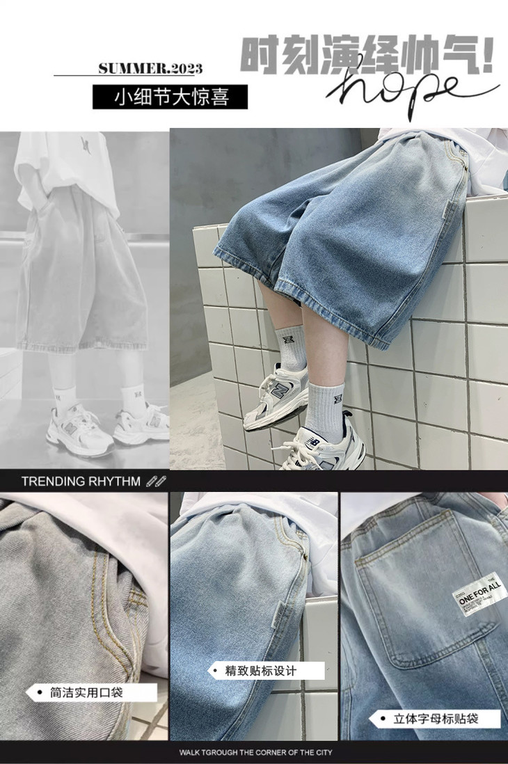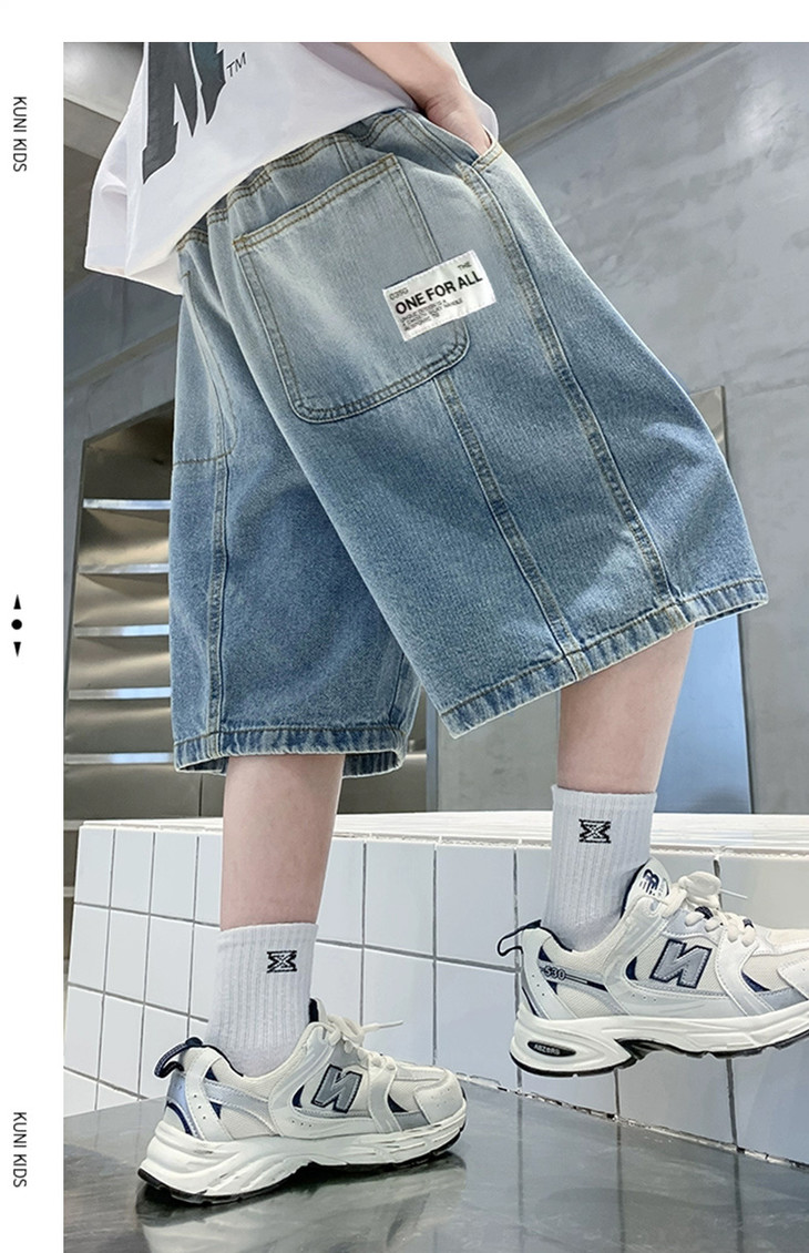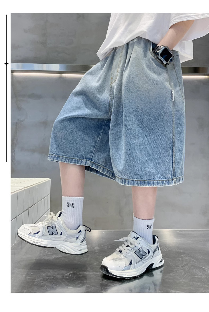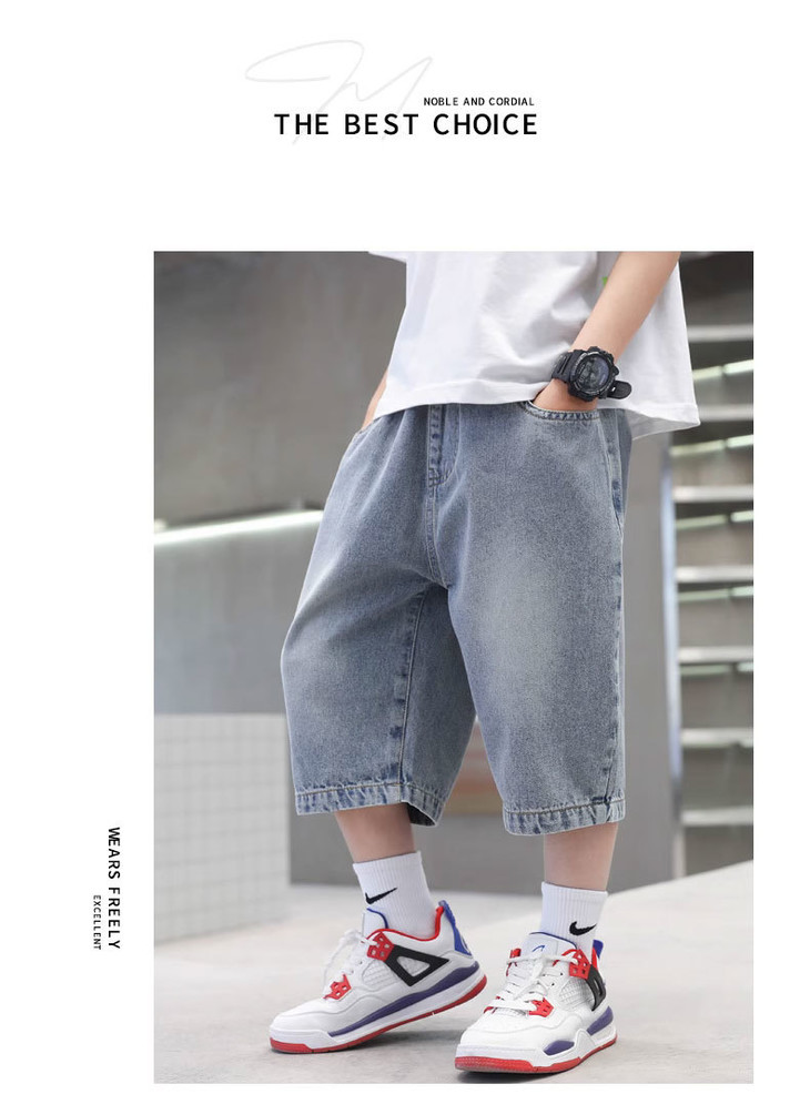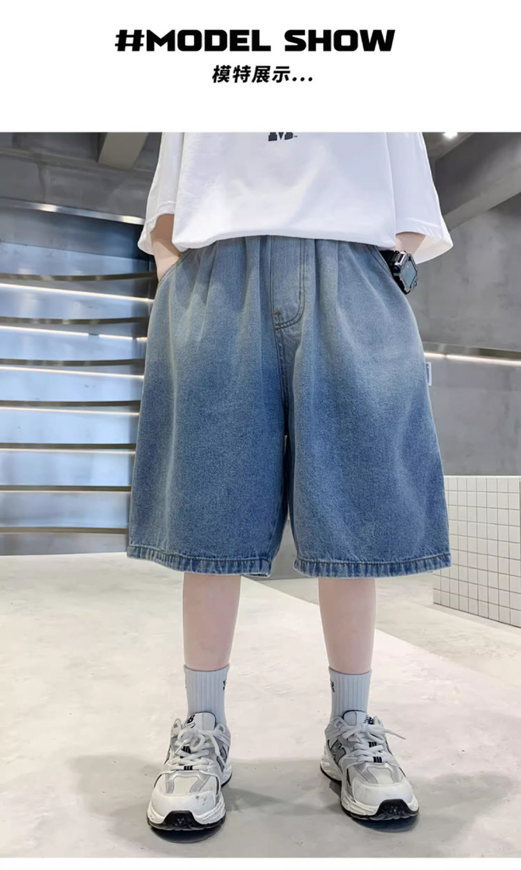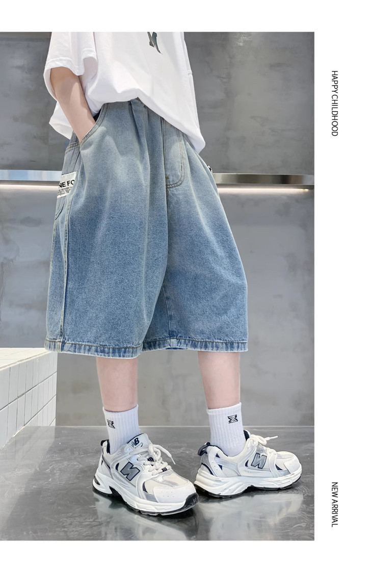第三款 潮流M字母牛仔短裤 🌟潮流外观 独特字母刺绣:裤子上超酷的 “M” 字母刺绣,个性又吸睛,瞬间提升时尚感,宝贝穿上就是街头最靓的仔😎。 宽松版型:宽松的剪裁,不紧绷、不束缚,走路带风,痞帅范儿十足,舒适与时尚完美兼得。 🎈优质面料 精选优质牛仔面料,透气又柔软,夏天穿着不闷热,给宝贝肌肤温柔呵护🥰。而且微弹的特性,让宝贝活动自如,跑跑跳跳无压力~