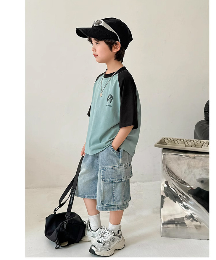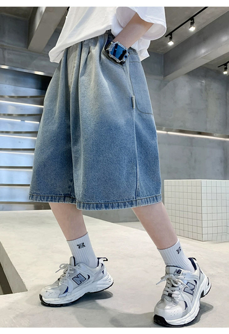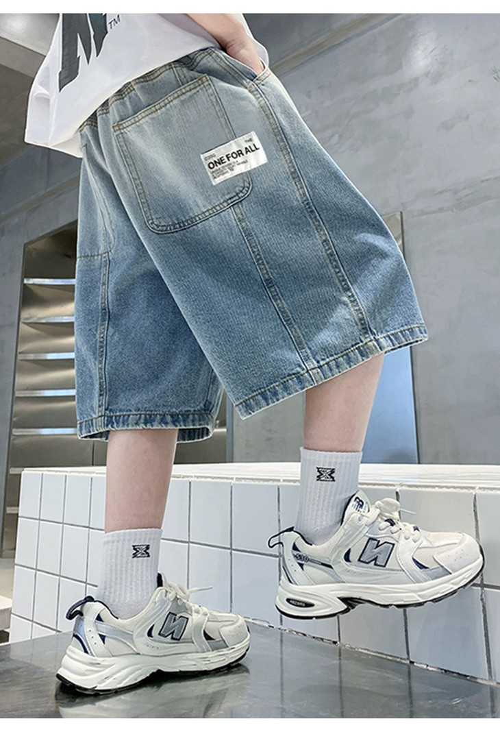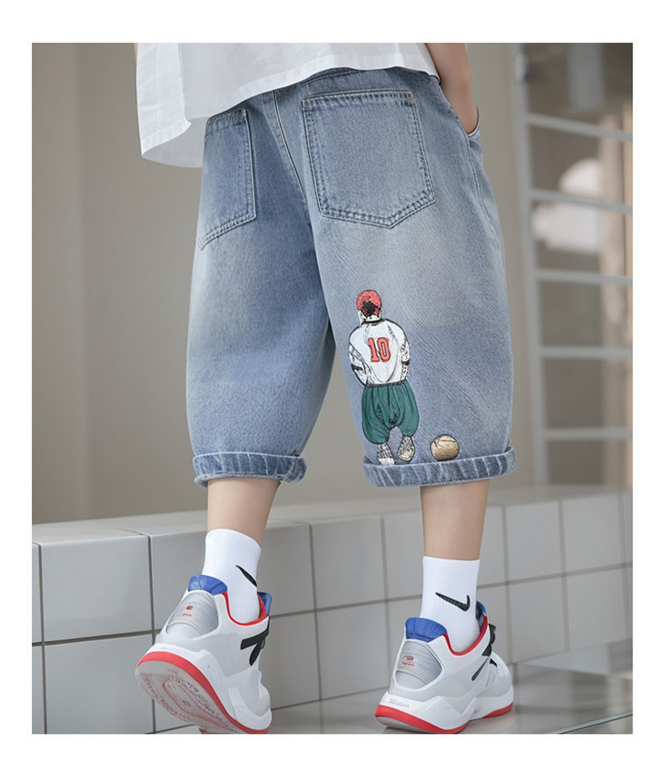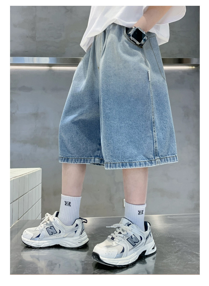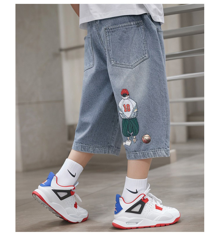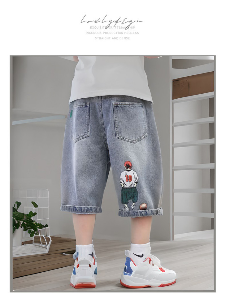 第三款 潮流M字母牛仔短裤 🌟潮流外观 独特字母刺绣:裤子上超酷的 “M” 字母刺绣,个性又吸睛,瞬间提升时尚感,宝贝穿上就是街头最靓的仔😎。 宽松版型:宽松的剪裁,不紧绷、不束缚,走路带风,痞帅范儿十足,舒适与时尚完美兼得。 🎈优质面料 精选优质牛仔面料,透气又柔软,夏天穿着不闷热,给宝贝肌肤温柔呵护🥰。而且微弹的特性,让宝贝活动自如,跑跑跳跳无压力~