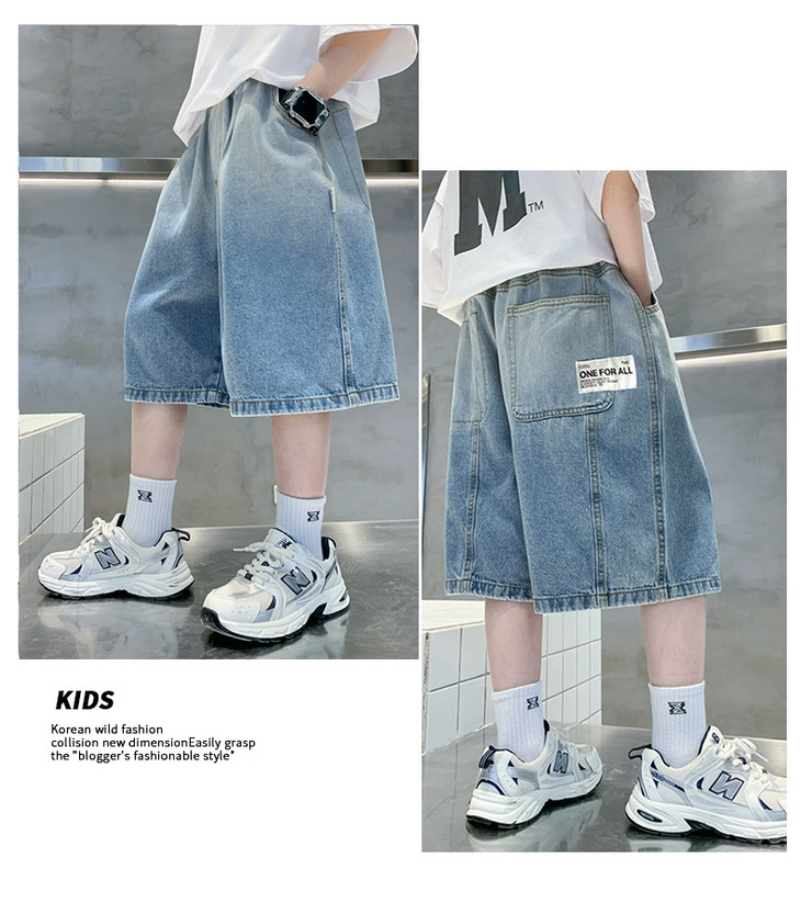 第四款 渐变拼色牛仔短裤 这条渐变拼色牛仔短裤,绝对能让你家小帅哥脱颖而出,成为街头焦点💥! 💥颜值即正义 渐变拼色设计:独特的渐变色调,从浅蓝到深蓝自然过渡,再加上巧妙的拼色元素,打破常规牛仔的单调,时尚感直接拉满😎。走在街上,宝贝就是最亮眼的存在,回头率爆表! 个性口袋装饰:大口袋设计实用又有型,搭配 “ONE FOR ALL” 立体字母标贴袋,增添潮流氛围。让宝贝的穿搭既有细节亮点,又不失整体的酷帅风格。
