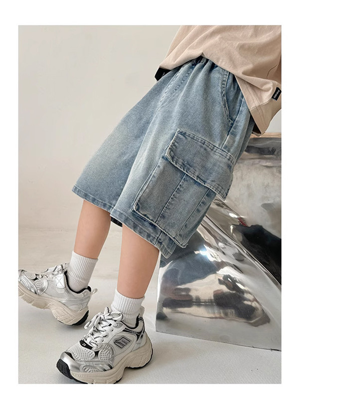 第二款大口袋牛仔短裤 👖 设计超有型 大口袋设计,痞帅痞帅的,个性又实用。宝贝可以把小玩具、小零食统统装进去,秒变 “百宝袋”😎。 弹力松紧腰,不勒小肚肚,穿脱超方便。宝贝自己就能轻松搞定,还能自由调节舒适度,活动起来无拘无束~