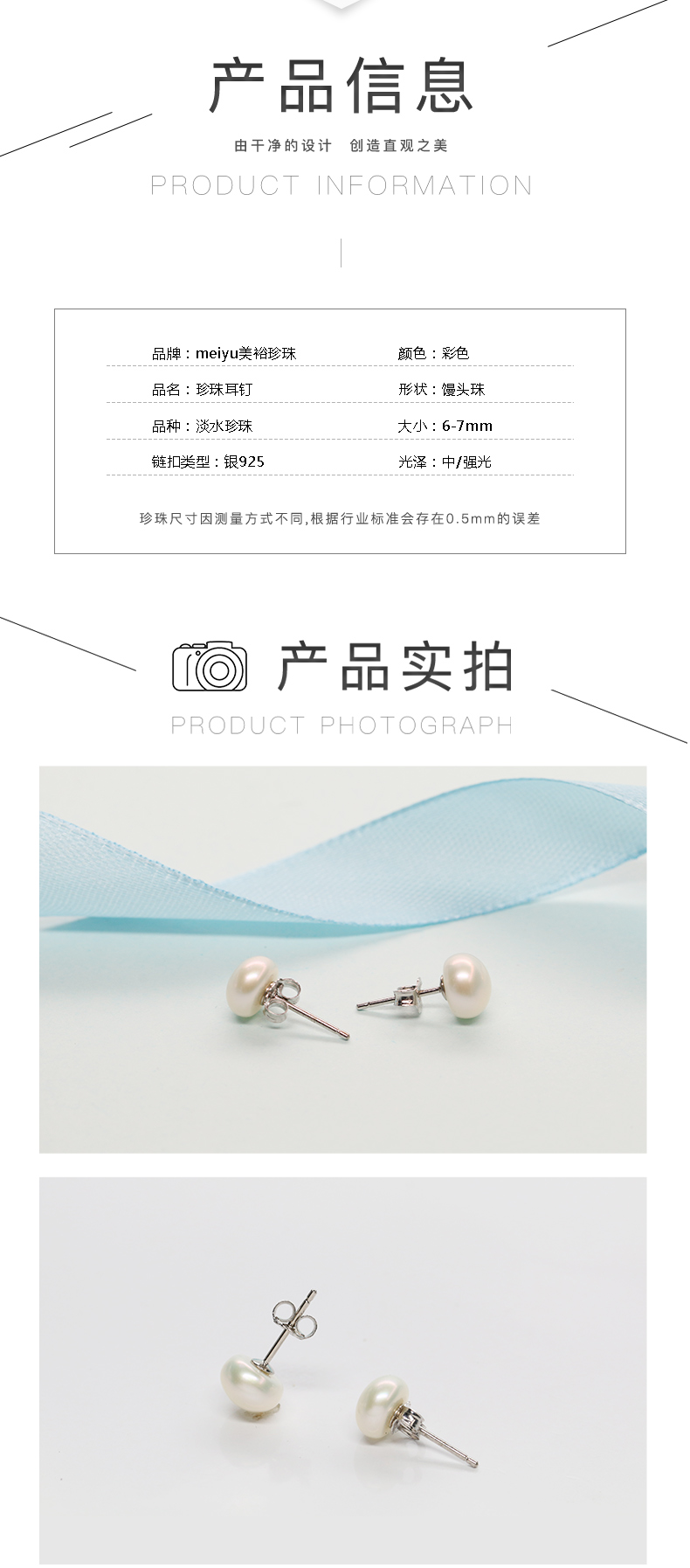 美裕【若华】银925淡水珍珠耳钉 6-7mm彩一根针 104983