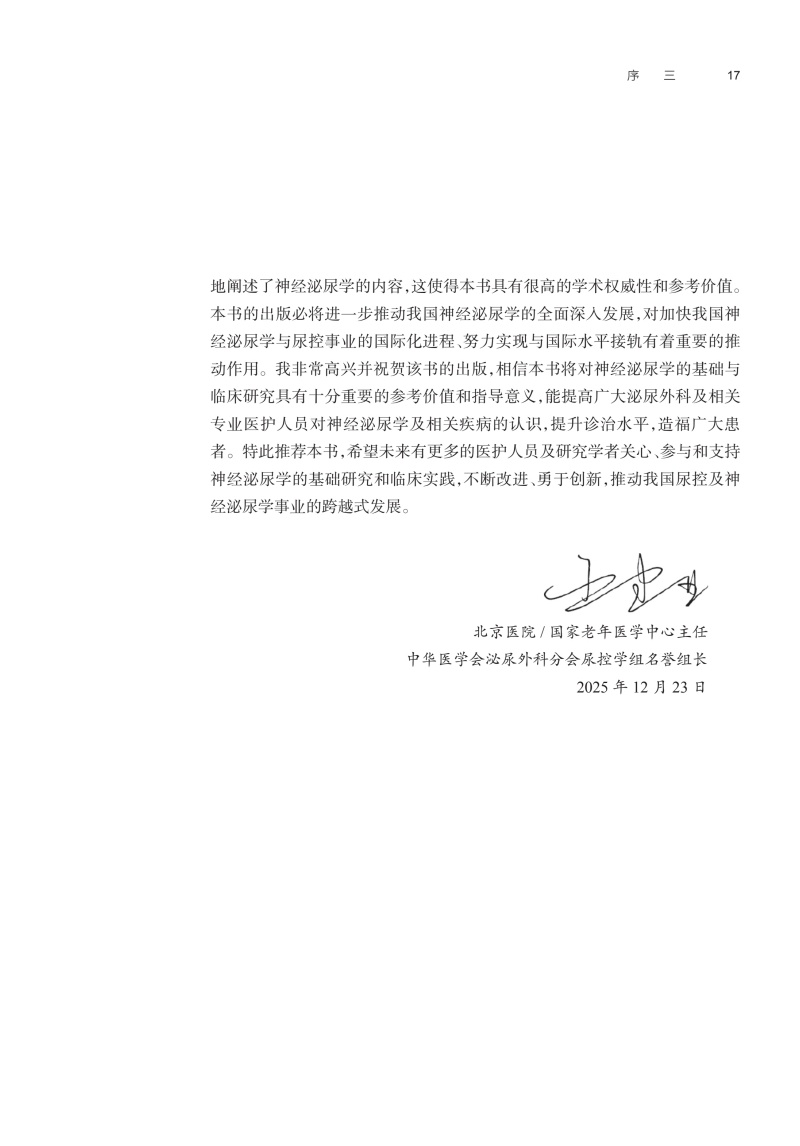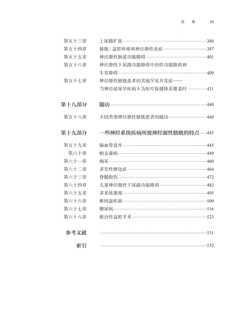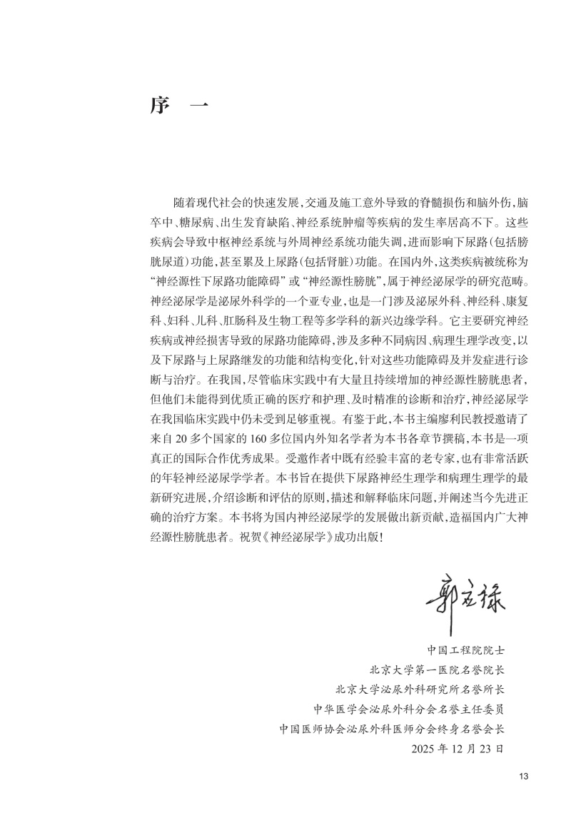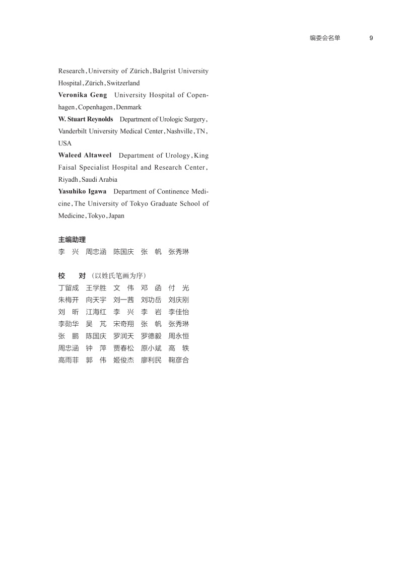 本书共68章,分篇编者为来自欧洲、亚洲、北美洲和南美洲的23个国家的87位神经泌尿学的国际知名专家。**部分从泌尿道的基本解剖学入手,引导读者逐步了解下尿路(LUT)神经支配和神经控制的复杂基础科学知识, LUT的生理学和药理学; 阐明各种神经系统疾病引起的上下泌尿道病理生理变化,流行病学资料及危险因素; 描述神经源性上下尿路功能障碍的分类标准。 在**部分的基础上,**部分全面系统地阐述了从症状评估开始到内镜检查的神经源性膀胱的诊断和评价,重点是LUT的尿动力学检查和电生理检查。第三部分描述了世界上神经源性膀胱的各种治疗方法,具有很大篇幅,包括经典的传统方法和有争议的新方法,后者我们试图要求作者提供一个基于证据、客观、科学、公正地描述了新疗法的现状、优缺点和未来前景。治疗部分从非侵入性方法开始,包括下尿路康复、药物和间歇性导尿,并逐渐转变为多种微创疗法,然后转向传统的开放手术,内容非常全面。第四部分全面介绍了神经源性膀胱引起的尿路感染、疼痛及其他并发症,以及相关的肠功能障碍、性功能障碍和生殖功能障碍,并强调了随访的重要性。本书的最后部分(第五部分)描述了10种神经系统疾病引起的神经源性膀胱的特异性,包括儿童神经发育异常,成人脊髓损伤等。