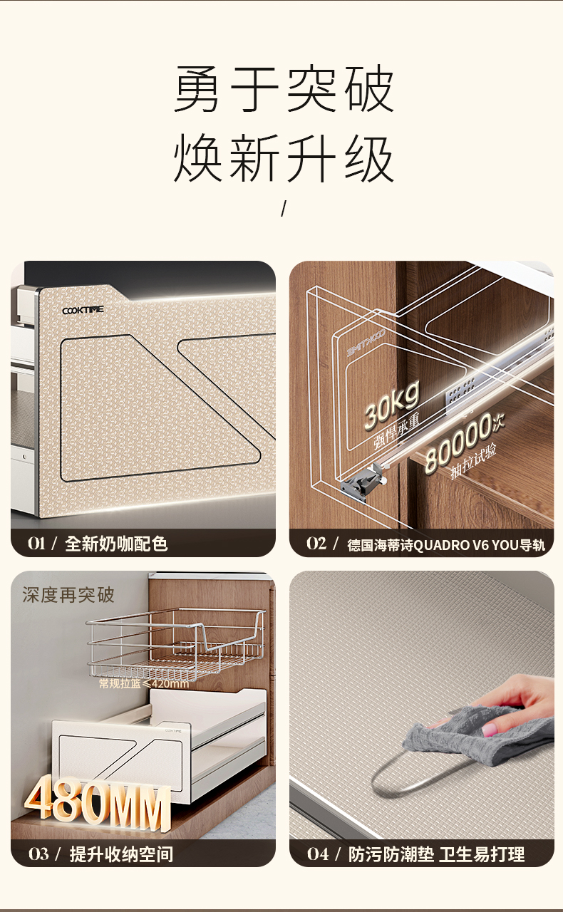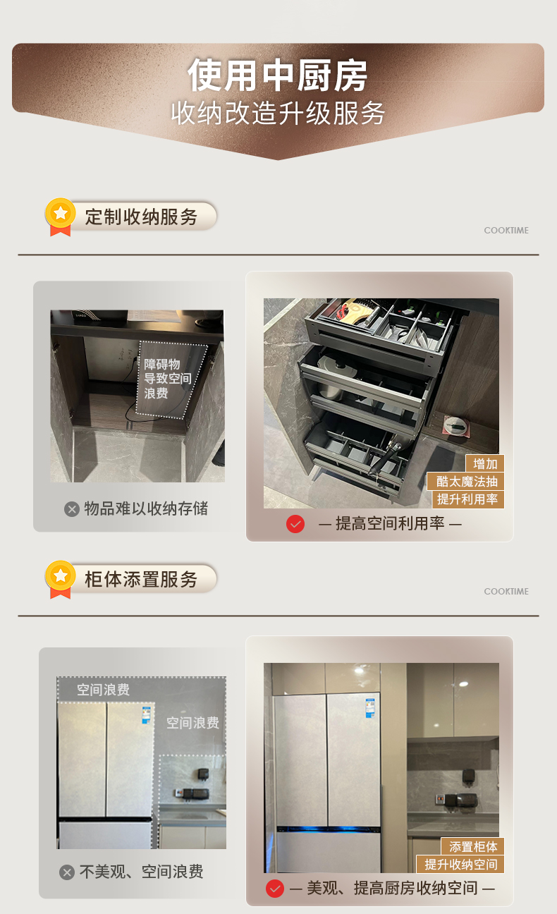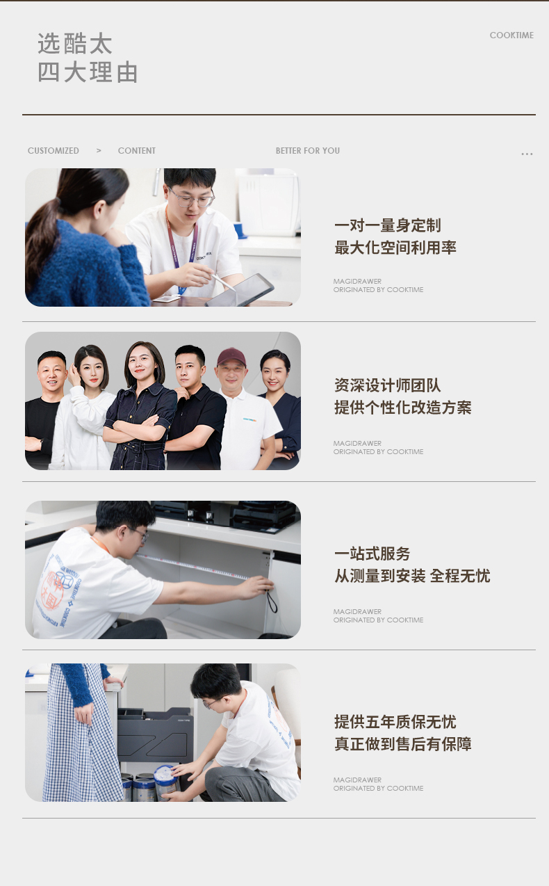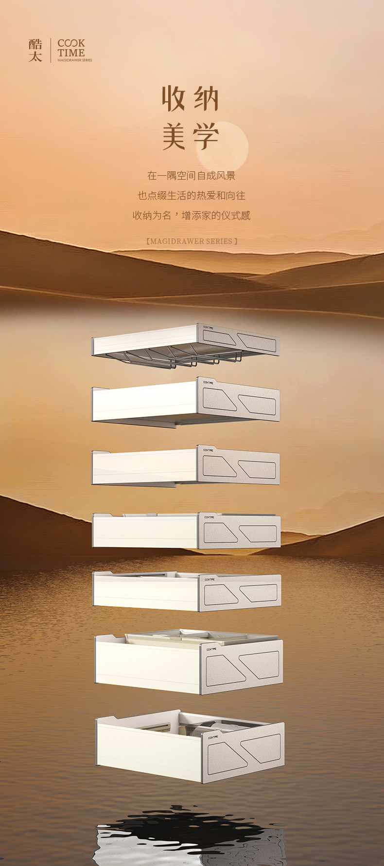 - 酷太坚持8年自主研发,已获得专利证书130项,拥有一套领先市场的厨房收纳系统,为千万中国家庭解决厨房脏乱差,缔造厨房新生活。