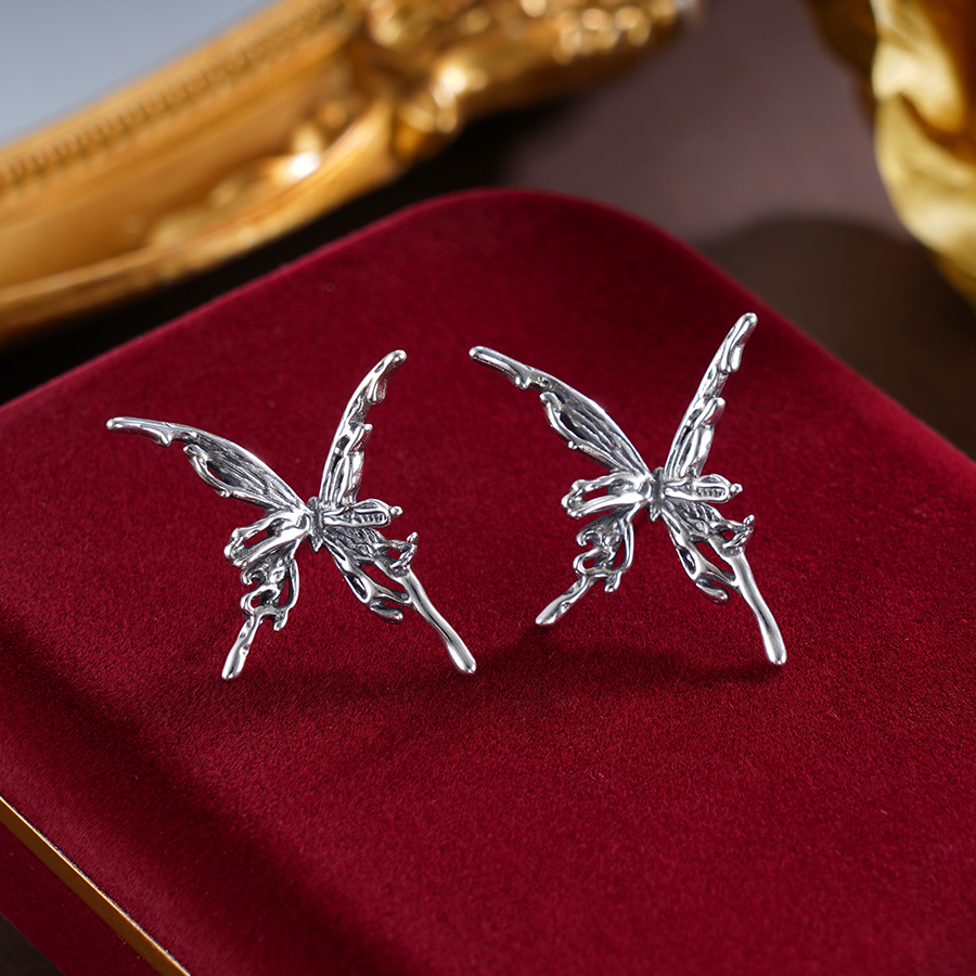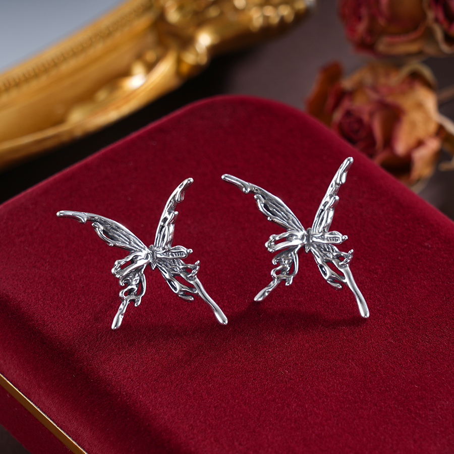 【寓意】:纯银蝴蝶耳饰,表面呈现熔岩肌理质感,神秘梦幻,质感拉满。蝴蝶停留之处,福气翩然而来。