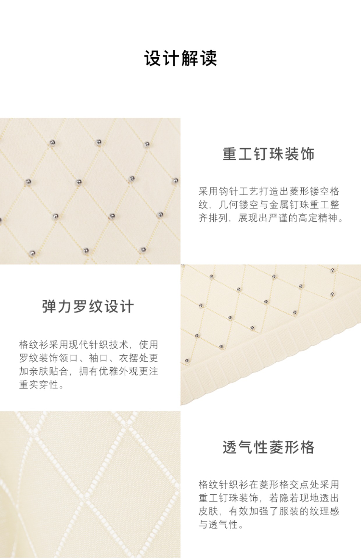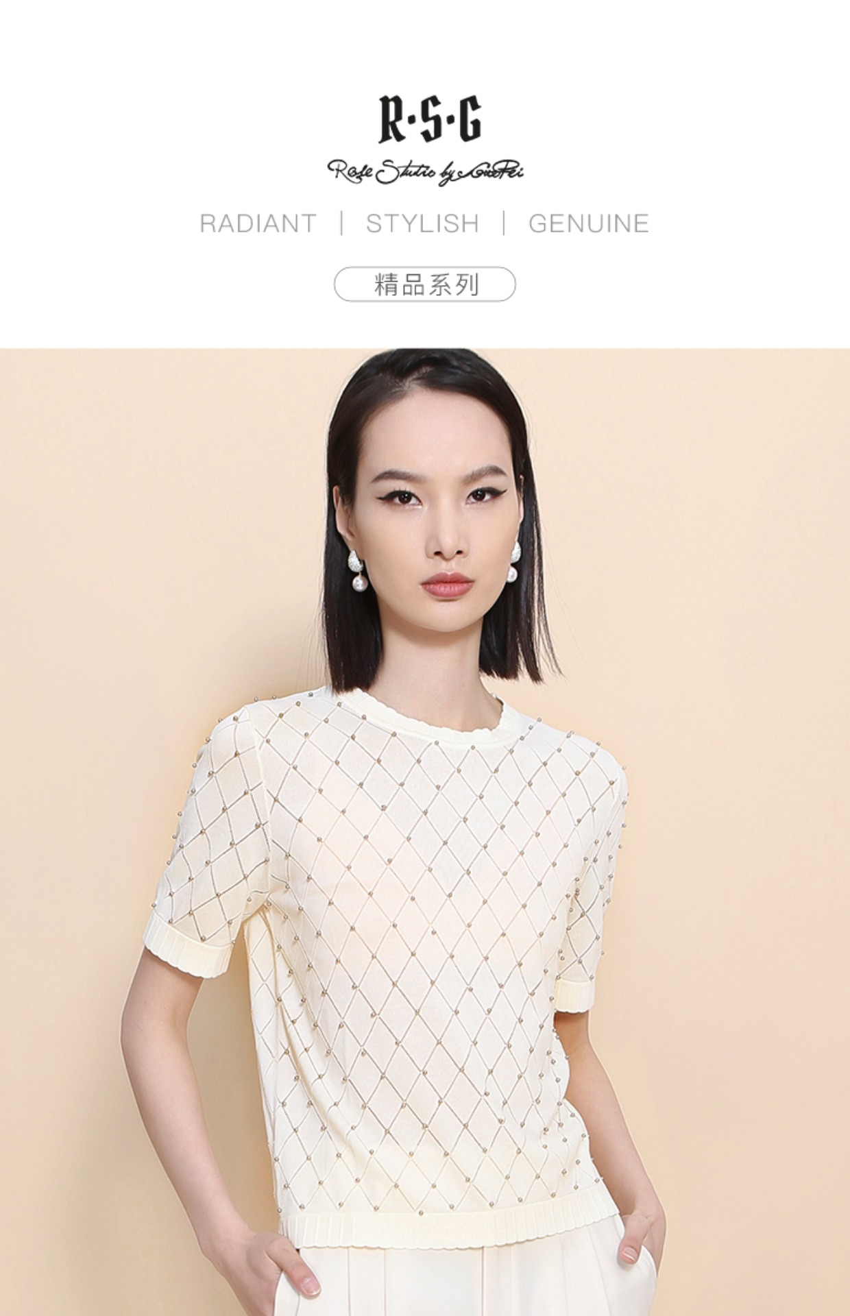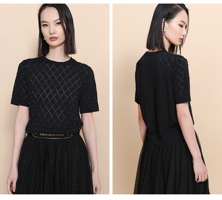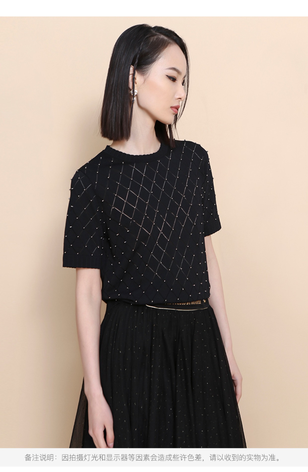 RSG郭培成衣品牌 夏季新款镂空钉珠装饰格纹针织薄款上衣