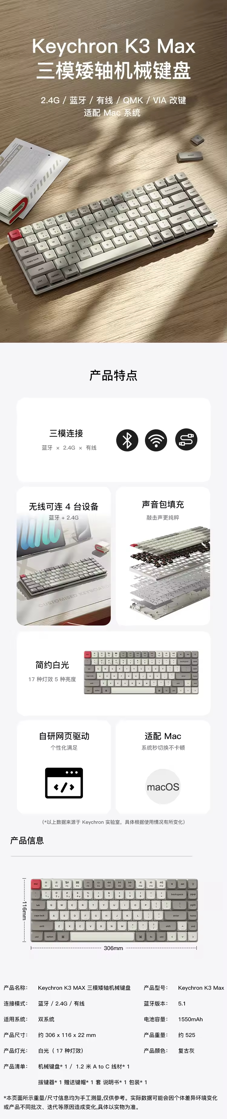 KEYCHRON渴创 K3 MAX 三模矮轴机械键盘