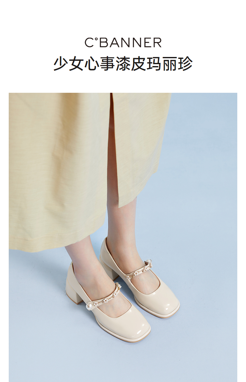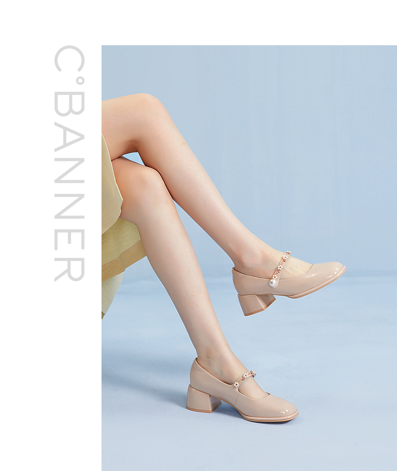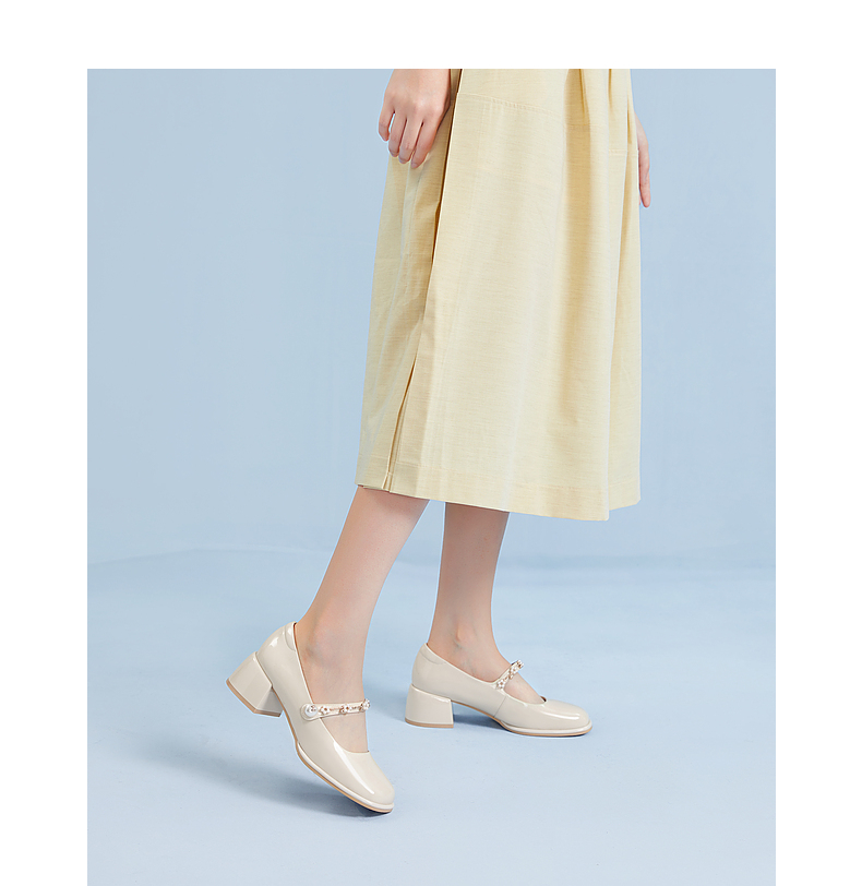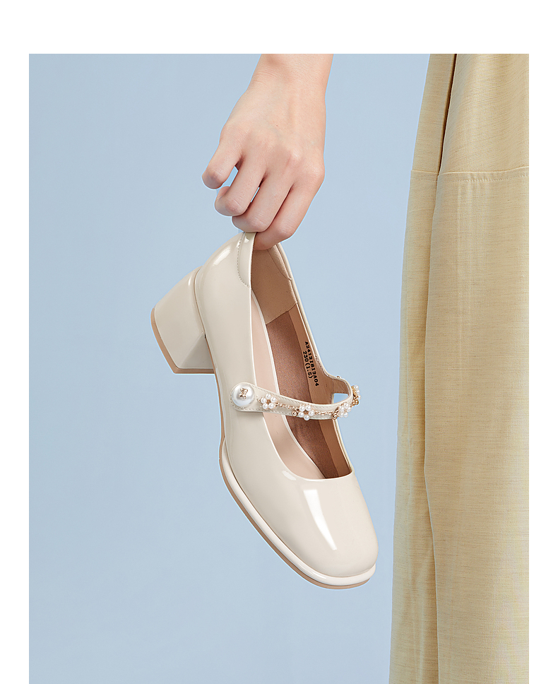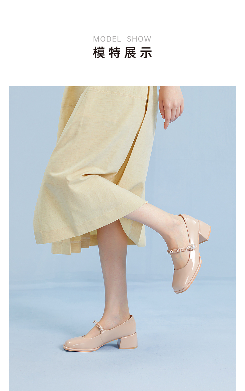千百度粗跟高跟真皮玛丽珍鞋女春季晚晚鞋法式单鞋高级感A24121813