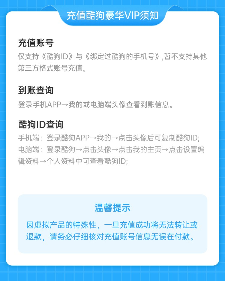 购买须知: ★ 下单前请您务必仔细阅读产品中各项说明,然后在下单订购 ★ 下单购买后,则视为您已仔细阅读本产品中的各项说明,并认同此声明以及产品规则,否则责任自负,不在售后服务之内 产品说明: 充值账号:请填写酷狗音乐登录绑定的手机号,不支持在备注填写充值号码,仅支持下单默认的充值手机号,请不要填错 不清楚自己绑定的手机号是什么,请务必查询确认好! 充值时间:本产品为慢充,下单后24小时内到账,请勿催单 到账核实:下单后24小时未到账,请先登录自己的账号查看,退出重新登录查看,如确实未到账,请及时联系客服 注意事项: 顾客下单后自动充值,发货状态并不会立刻变成已发货,已经充值成功无法退换 虚拟充值产品不适用于七日无理由退货条款,一经购买,不退不改 因个人原因造成充值错误,责任自负,不予退款 如遇市场断货问题,平台将无条件为客户进行退款 |