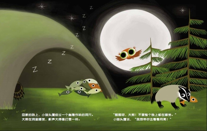 太阳落下,月亮升起,白天外出的动物纷纷进入梦乡。这时候,有另一群夜行动物,正悄悄开始一天的活动。小猫头鹰在星空下的森林漫游,他看见负鼠一家摇摇晃晃的往前行、刺猬在蘑菇丛中又闻又嗅、*忙着啃树干、萤火虫在乌龟身边飞舞。回家的路上,小猫头鹰经过大熊的洞穴,他想找大熊一起去看美丽的星空,可是大熊在一直呼呼大睡,鼾声大得像打雷一样……