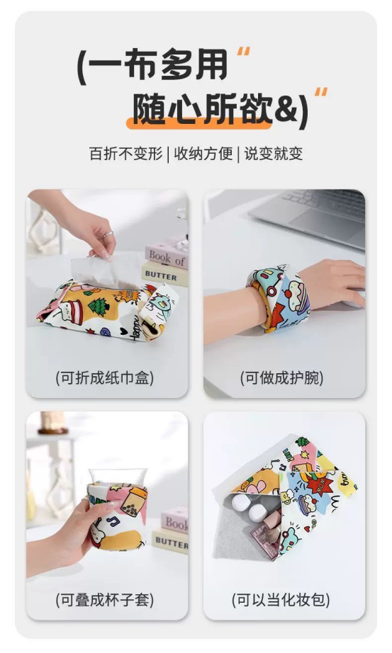 【一布多用太绝了!】 能折成纸巾盒 让居家办公更有童趣 能做成护腕 缓解鼠标手超贴心 能叠成杯子套 隔热又好看 还能当化妆包 收纳美妆品超方便! 一款布四种用法 实用又可爱 快团赶紧抢~