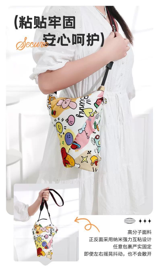 ✅魔术自粘 牢固安心 ——黑科技加持的收纳安全感 ✅正反面采用纳米强力互粘设计 这一高科技无磁铁自粘技术 ✅让它在包裹物品时能严丝合缝地固定住 无论是当作相机包斜挎在身 ✅还是将化妆品收纳包放入手提包 让你不用担心物品掉落或散落 给予你满满的收纳安全感