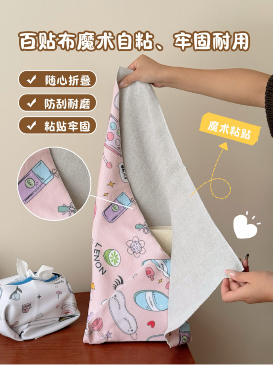 👉少女心事款【少女心爆棚!这款收纳布太懂女生了】粉粉嫩嫩的少女心事款满印美妆小图案戳中少女心! 它能折纸巾盒、护腕、化妆包收纳美妆品超合适 魔术自粘还耐磨让收纳也变得甜美元素满满~