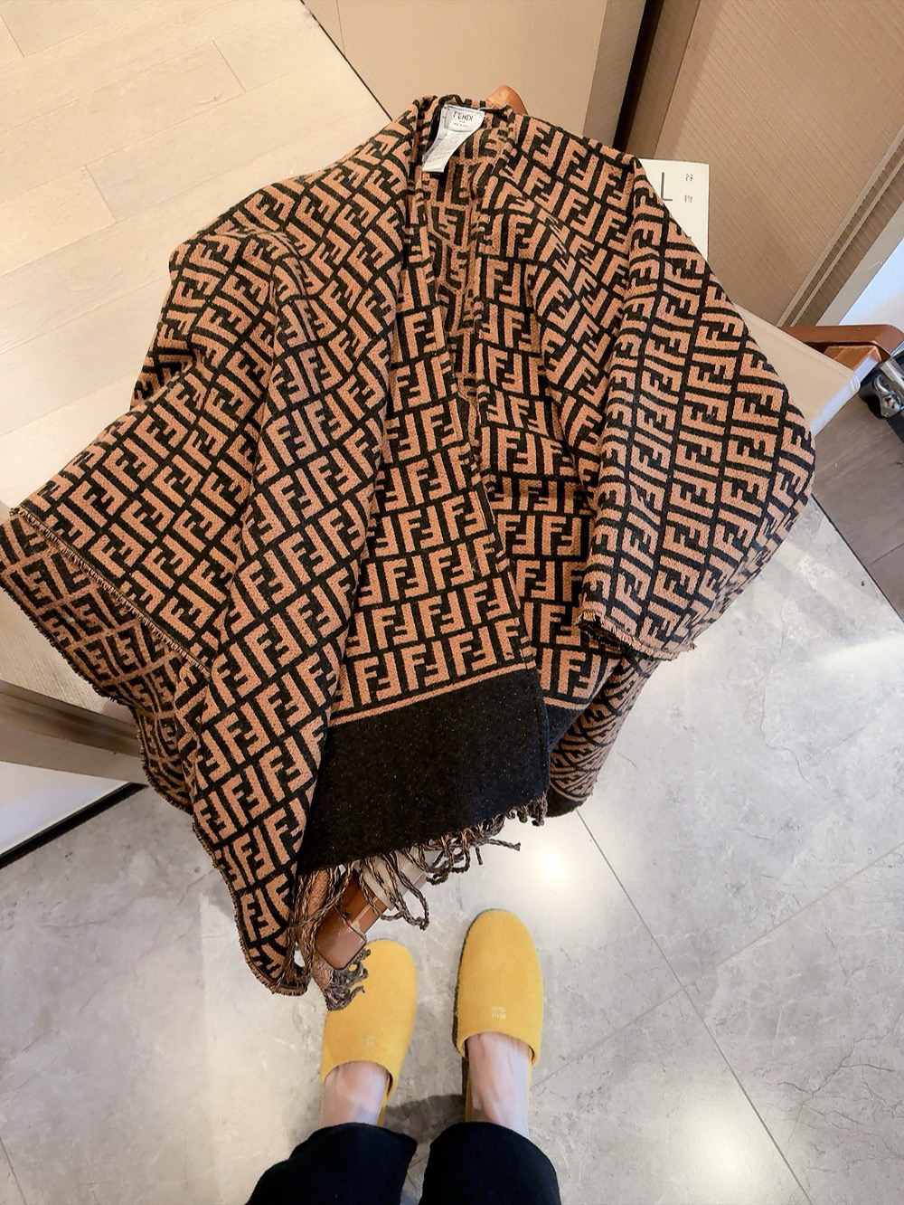 秋冬特惠💰260 芬迪围巾 男女同款 罗马组合斗篷 尺寸:140*140cm,颜色:棕色 白色 羊毛和羊绒混纺斗篷,饰有全幅象牙白和米色提花FF图案。对比色底面缀有F家Roma标志,采用流苏装饰