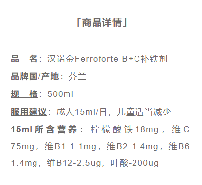 补铁口服液/芬兰汉诺金/Ferroforte B+C/浆果复合液态铁/儿童成人孕妇老人