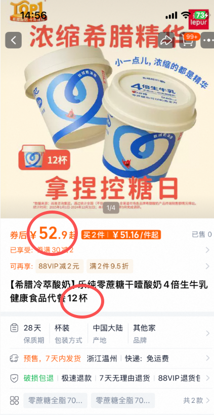 老米优品🎈15盒!低卡0糖减脂期最爱!乐纯轻盈系列 Lite希腊零蔗糖原味希腊式发酵乳 70g*15盒