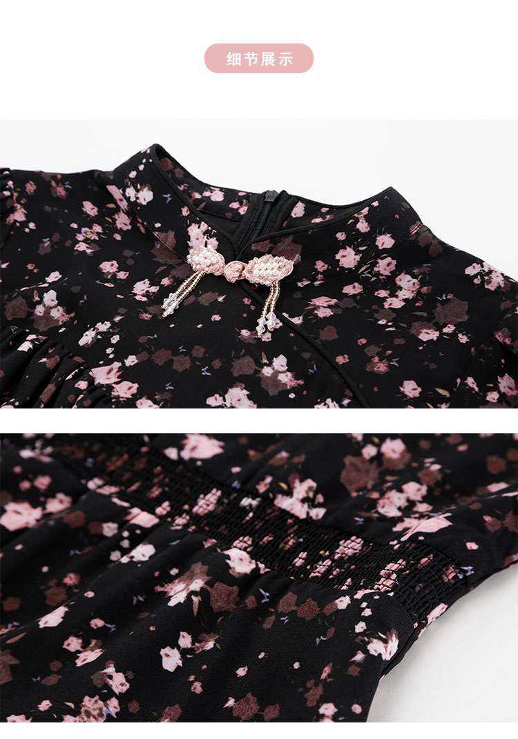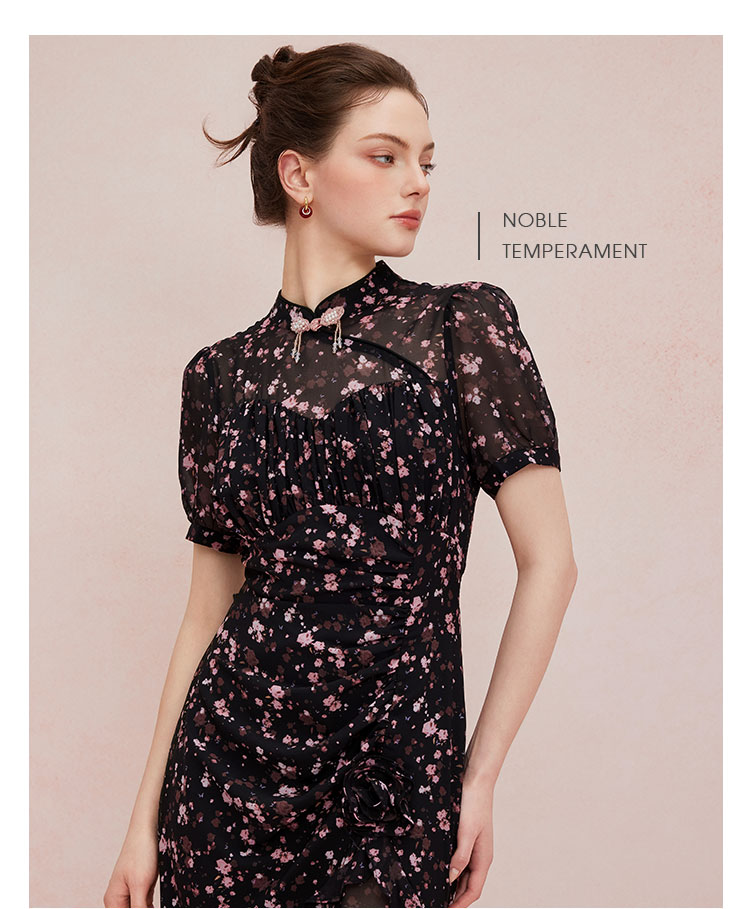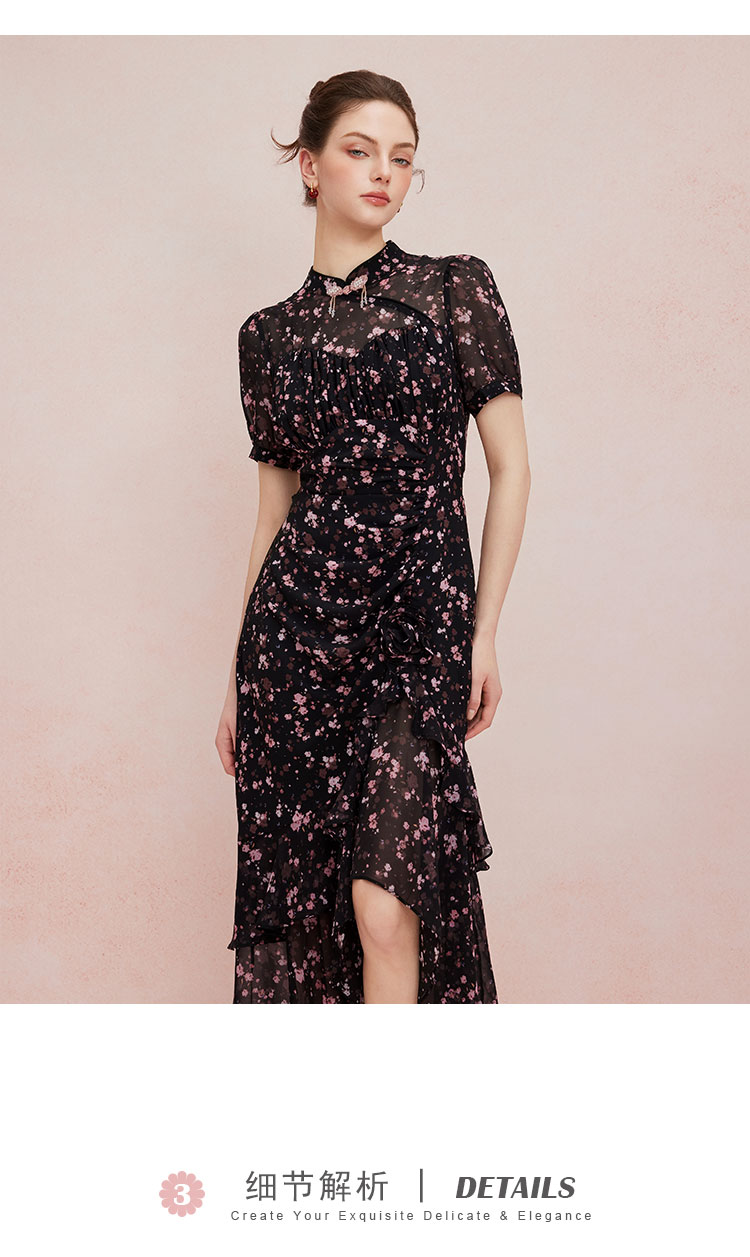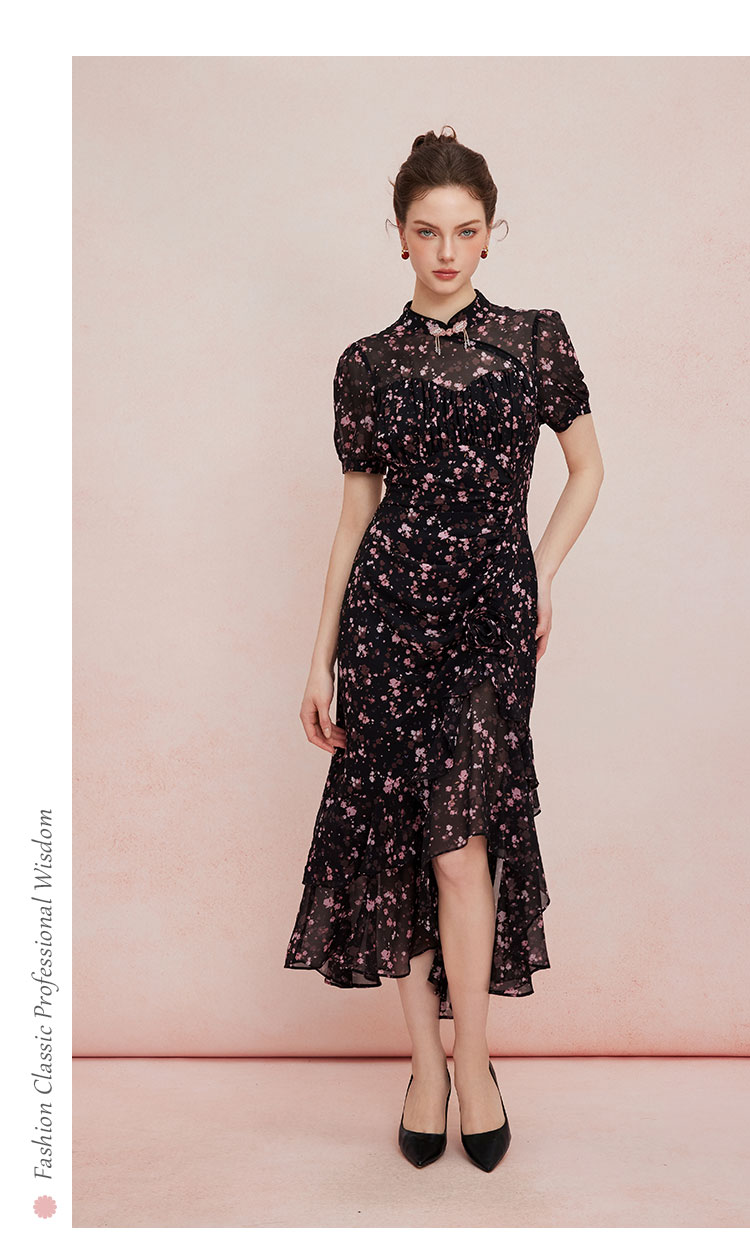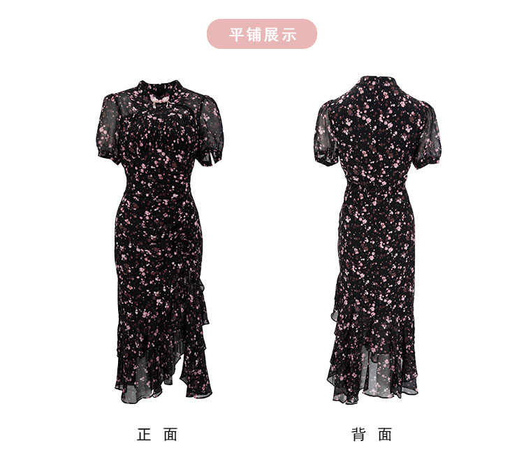 QF83025新款改良旗袍修身立体盘花腰间打褶藏肉不规则波浪裙摆连衣裙