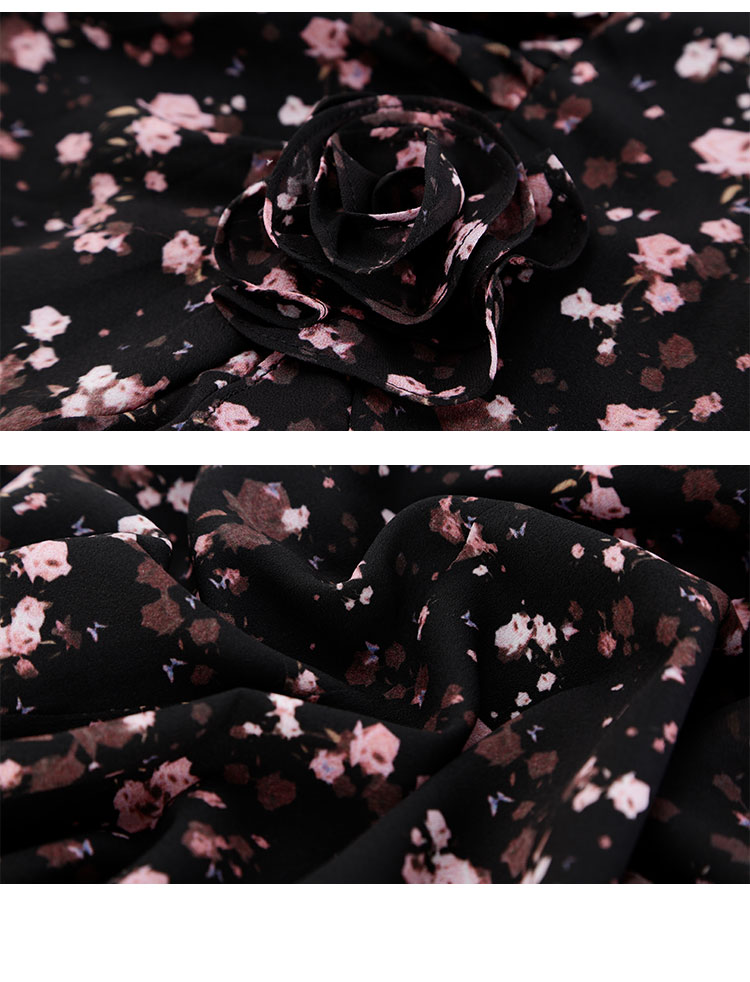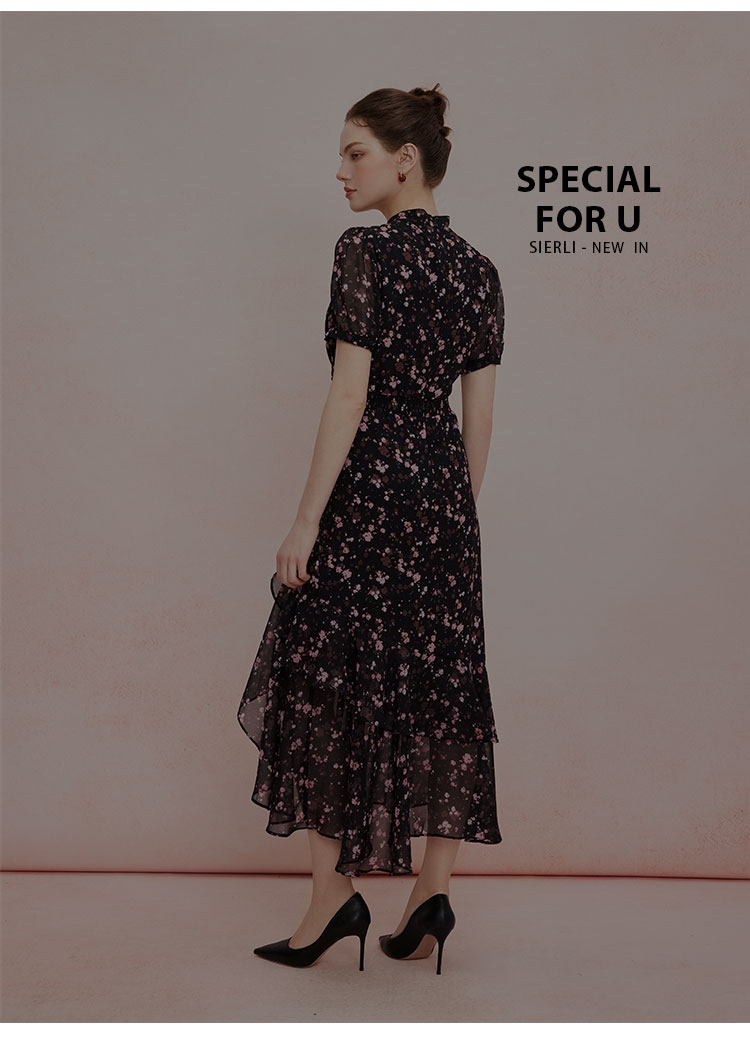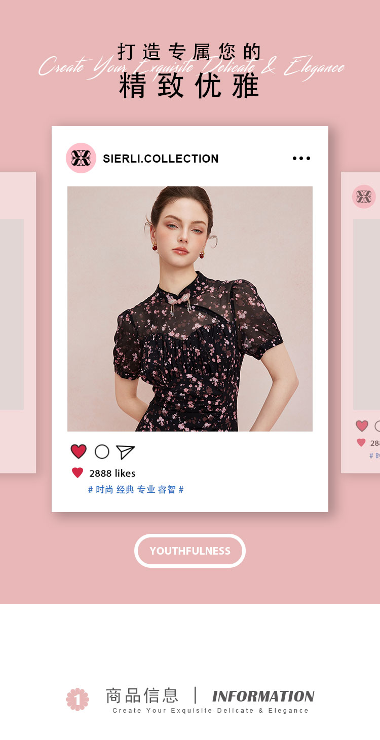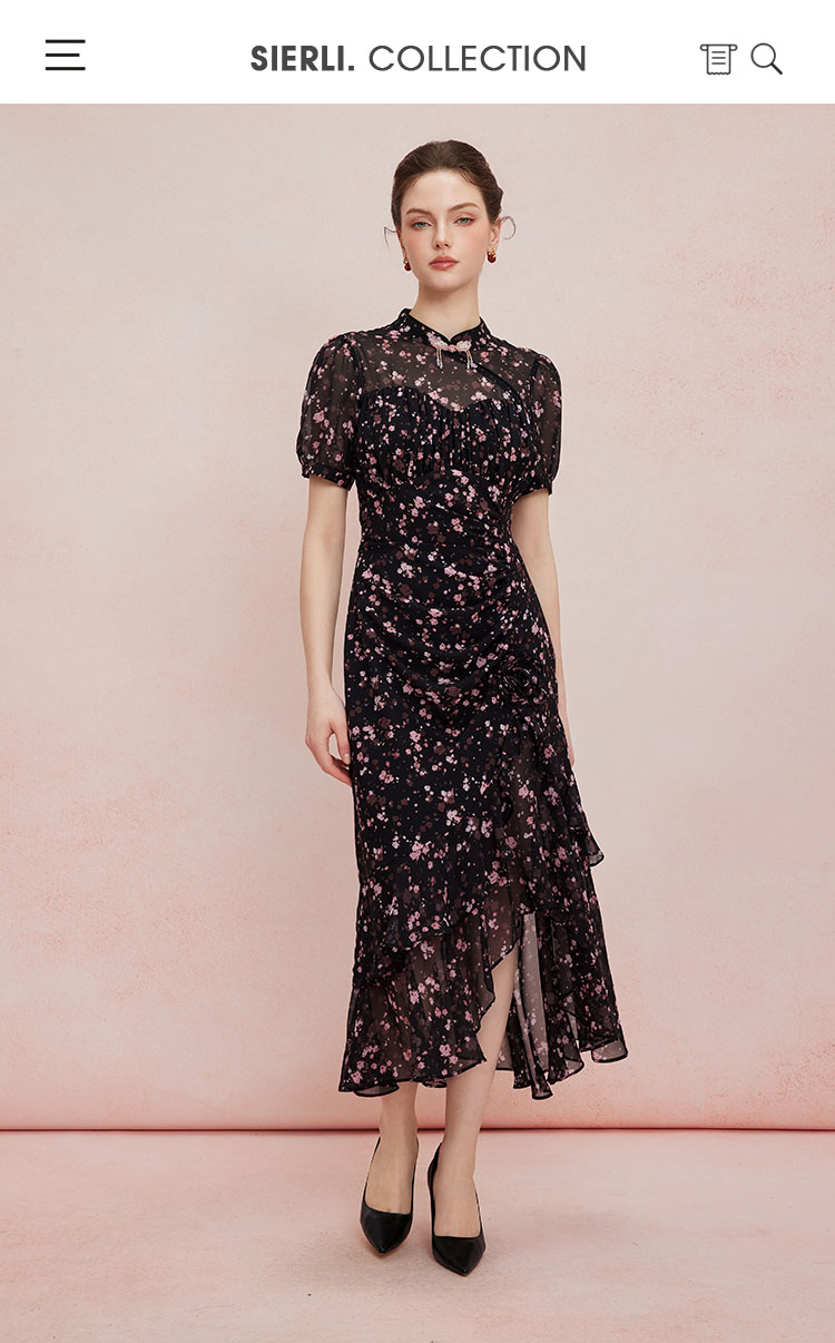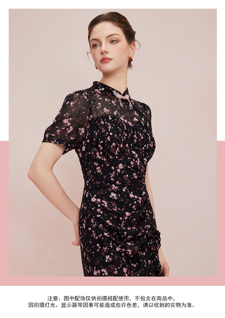 QF83025新款改良旗袍修身立体盘花腰间打褶藏肉不规则波浪裙摆连衣裙