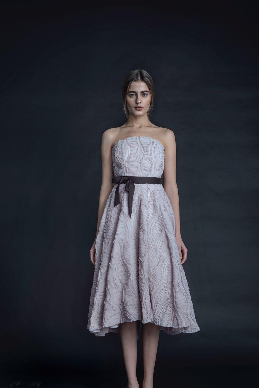 烟熏紫系带抹胸蓬裙尽展女性清新淑女的公主一面。高雅的烟熏紫配合立体的图案,呈现高贵精致的魅力。A字廓形极为美化身形,内附裙撑打造出丰盈立体感,带着复古气息,唤醒优雅俏皮的时尚基因。腰身处的黑色系带形成优美的收腰效果,完美地勾勒出婀娜身姿。